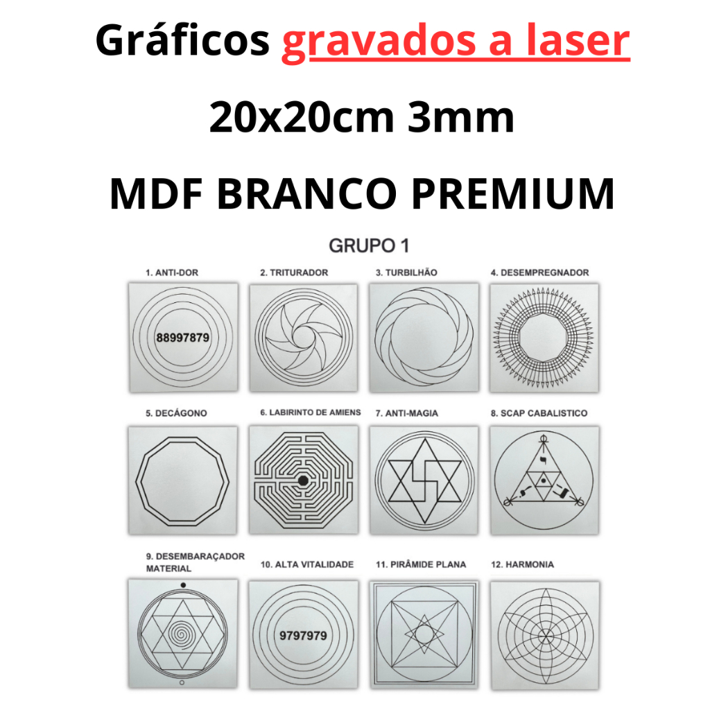 Kit 12 gráficos da Radiestesia MDF BRANCO 20x20cm 3mm + Kit 7 Piramides + Gráfico Chakras + Caixa +Régua Bóvis + Relógio
