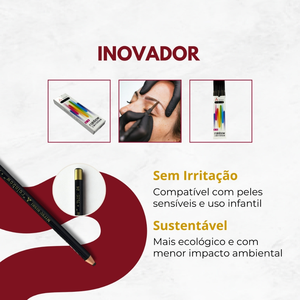 Lápis Dermatográfico Mitsubishi Rainbow Preto Original p/ Design de Sobrancelhas - 12 Unidades Lápis dermatográfico Mitsubishi Rainbow p/ micropigmentação, Design de sobrancelhas, microblading, marcação da pele, design facial. O lápis ideal para quem trabalha com design de sobrancelha e estética. Solúvel em água, permite marcações precisas e fáceis de remover, sem deixar resíduos ou interferir na pigmentação. Benefícios: Solúvel em água: marcações saem com facilidade Alta precisão: ponta fina para linhas definidas Sem oleosidade: não atrapalha pigmentação Escreve em múltiplas superfícies Original Mitsubishi: qualidade japonesa Indicações de uso: Micropigmentadoras e designers de sobrancelha Estúdios de estética, tatuadores, dermatologistas Uso geral em vidro, plástico, papel, metal Diferenciais: Preferido para micropigmentação Remoção fácil com água Visual similar ao Mitsubishi 7600, mas sem base oleosa Como usar: Aplique diretamente na pele para marcação antes da micropigmentação. Remova facilmente com algodão e água após o procedimento. PERGUNTAS FREQUENTES: É o mesmo que o lápis Mitsubishi 7600? Não. Este modelo é solúvel em água, enquanto o 7600 é à base de óleo. Ideal para micropigmentação, pois não deixa resíduos oleosos. Sai fácil da pele? Sim. Basta água para remover a marcação com facilidade, sem agredir ou manchar. Serve apenas para sobrancelha? Não. Pode ser usado também em vidro, plástico, metal, cerâmica, papel, tecidos e outras superfícies. A ponta é grossa? Não. É fina, precisa e ideal para linhas delicadas. É original Mitsubishi? Sim. Produto 100% original da marca japonesa Mitsubishi.