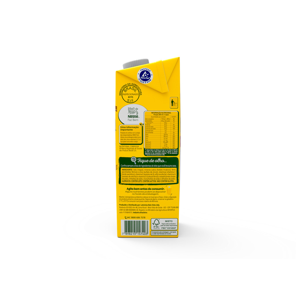 Kit 12 Leite Ninho Integral UHT 1L Nestlé cada. O Leite Ninho Integral UHT 1L Nestlé é uma opção prática, nutritiva e saborosa para o dia a dia da família. Produzido a partir de leite 100% de vaca, passa pelo processo de ultrapasteurização (UHT), que garante maior segurança e durabilidade sem necessidade de refrigeração antes de aberto, preservando suas características nutricionais e o sabor natural do leite. ✅ Principais Características: Tipo: Leite UHT Integral. Volume: 1 litro. Marca: Nestlé Ninho, referência em qualidade e confiança. Conservação: longa vida (validade estendida sem refrigeração, enquanto fechado). Sabor: encorpado e natural, característico do leite integral. 🌱 Benefícios Nutricionais: O Leite Ninho Integral é uma excelente fonte de nutrientes essenciais para todas as idades: Cálcio: fundamental para a formação e manutenção de ossos e dentes fortes. Proteínas: auxiliam no crescimento, na reparação dos tecidos e no desenvolvimento muscular. Vitaminas A, D e B12: importantes para a visão, imunidade, metabolismo energético e absorção de cálcio. Gordura natural do leite: contribui para fornecer energia e favorecer a absorção de vitaminas lipossolúveis. 👨👩👧 Indicação de Consumo: Ideal para acompanhar refeições, cafés, vitaminas, achocolatados, cereais e receitas diversas. Pode ser consumido puro, aquecido ou gelado. Excelente escolha para o café da manhã, lanches ou preparações culinárias. 📦 Embalagem: Caixa cartonada de 1 litro, com tecnologia que preserva o sabor e os nutrientes. Embalagem prática e segura, de fácil manuseio e armazenamento. ⚠️ Informações para Alérgicos: Contém leite e derivados. Contém lactose. Não é recomendado para pessoas com intolerância à lactose ou alergia à proteína do leite. ℹ️ Conservação: Conservar em local seco e fresco, ao abrigo do sol. Após aberto, manter refrigerado e consumir em até 3 dias.
