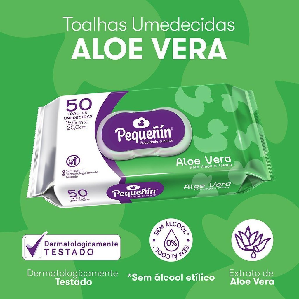 Kit Contém: 12 Toalhas Umedecidas Pequein Aloe Vera 50un cada Lenços Umedecidos Pequeín Aloe Vera oferecem suavidade superior à sua pele. Graças ao seu tecido macio e ao Aloe Vera, limpam eficazmente enquanto refrescam a pele do bebê. Toalhas umedecidas produzidas com extrato de Aloe Vera - possui propriedades que limpam e refrescam a pele; Textura supermacia e resistente que não deixam manchas e cuidam das peles mais delicadas; Sem álcool etílico que ajudam a evitar irritações na pele; Para garantir um produto confiável nossas toalhas são testadas dermatologicamente e contém água purificada que elimina componentes que podem criar ambientes propícios ao desenvolvimento de bactérias; Nossa toalha é maior e cobre toda mão e evitando contato com a sujeira, são mais espessas que ajudam a remover com mais facilidade os resíduos, limpando melhor e trazendo mais economia ao mesmo tempo.
