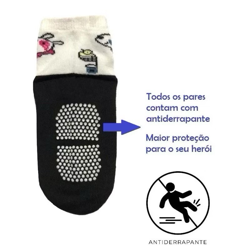 Kit 12 Meia Bebê Antiderrapante Estampadinha Masculina,0 a 6, 6 a 12, 12 a 24 mes