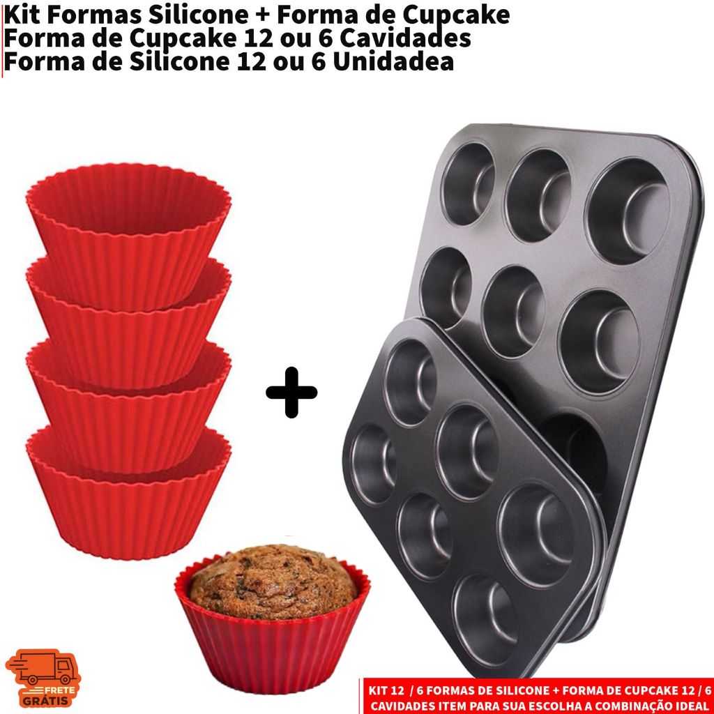 Kit 12 ou 6 Forminhas de Silicone Não Gruda + Forma de Cupcake 12 ou 6 Cavidades Antiaderente Empada
