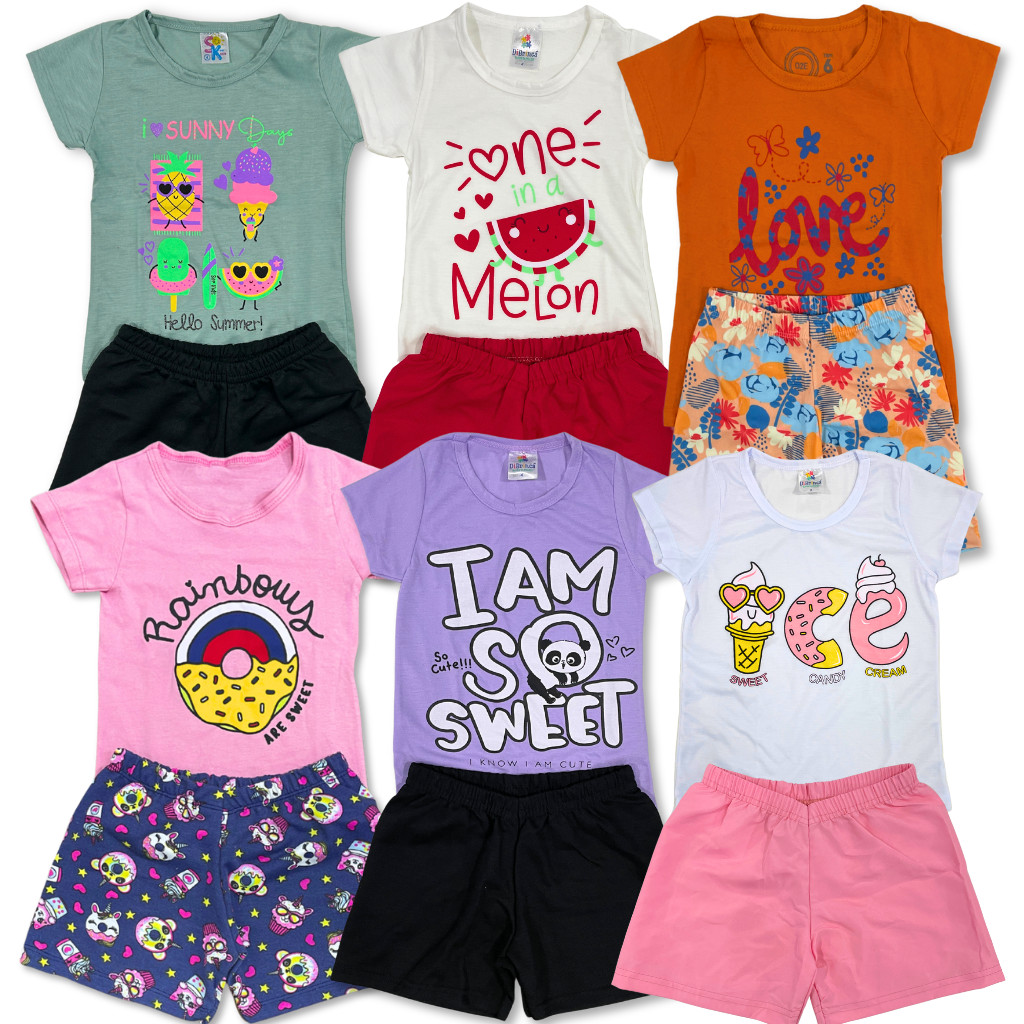 Kit 12 ou 6 peças 6 ou 3 Conjunto Roupa Infantil Menina Camiseta/Blusa + Shorts/Bermuda