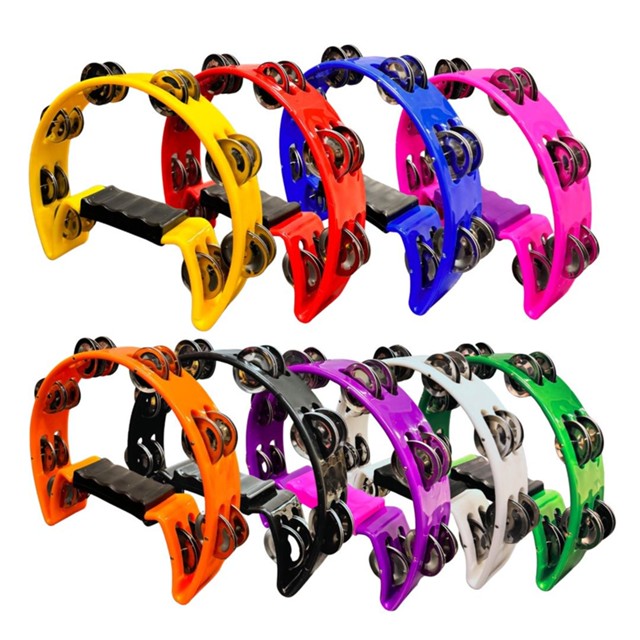 O Kit Contém 12 unidades de Pandeiros Meia Lua Coloridos (Sortidos) Feito em policarbonato - um plástico de alto impacto - e equipado com 16 pares de platinelas em inox. Caracteriza-se por um som bastante agudo e estridente. Este modelo possui manopla de plástico rígido.