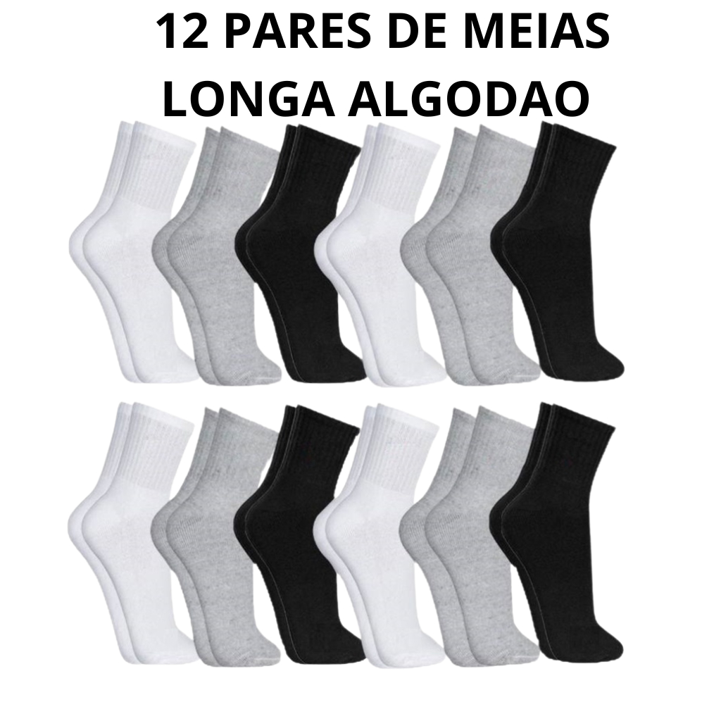 | Kit 12 Pares de Meia Masculina Algodão Cano Alto Longo este produto | R$ 28,90 | 28% | 4.8/5 | — |