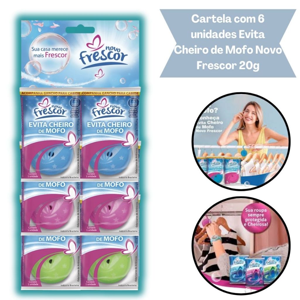 - Você pode usar o Evita Cheiro de Mofo Novo Frescor em gavetas, armários, closets, sapateiras, arquivos e muito mais. Sua poderosa formulação evita a presença de insetos como traças e baratas, além de deixar o ambiente com um agradável perfume. - Instruções de uso: Retire o produto da embalagem, o suporte plástico que acompanha o produto permite que possa ser pendurado em cabideiro, caso desejar. - Precauções e Segurança: Conserve fora do alcance das crianças e dos animais domésticos. Não expor o produto ao sol e calor acima de 35ºc. Não reutilizar a embalagem vazia. Lavar as mãos após o manuseio do produto. Em caso de contato com os olhos, lavar com água em abundância. Em caso de ingestão, não provocar vômito e consultar imediatamente o centro de intoxicações ou serviço de saúde mais próximo levando a embalagem vazia. Nunca reutilizar a embalagem vazia. - Fragrâncias disponíveis: Lavanda, Talco, Citrus - Conteúdo: 6 unidades. 2 UNIDADES DE CADA FRAGRANCIA ou 12 unidades. 4 UNIDADES DE CADA FRAGANCIA - Cada unidade contém 20g de pastilha e ganchinho para cabideiro
