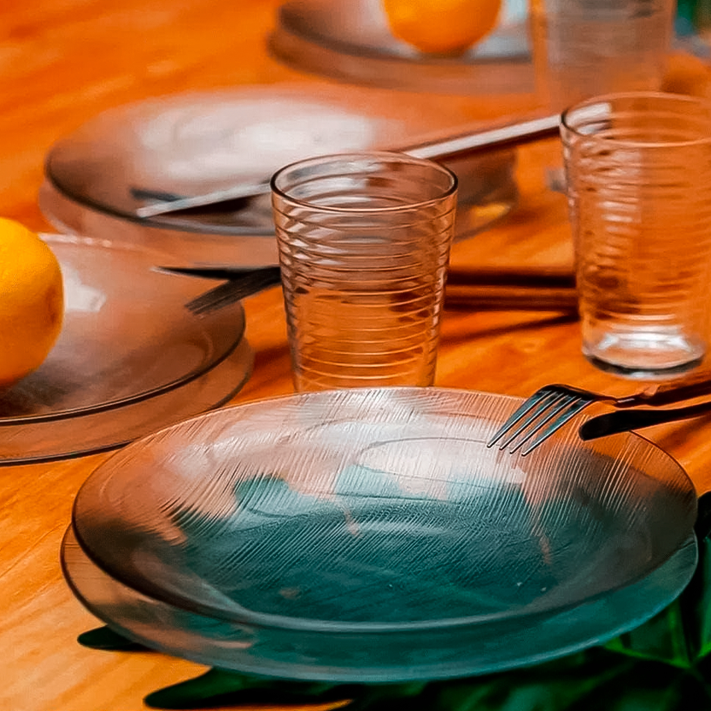 KIT 12 Peças 6 Pratos Fundo Diamante Duralex e 6 Copos Ginga 265ml Vidro vai ao freezer geladeira