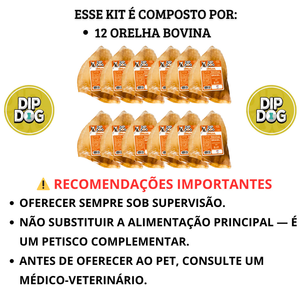 Kit 12 Petisco Natural Orelha Bovina Desidratada Para Cachorro Dip Dog