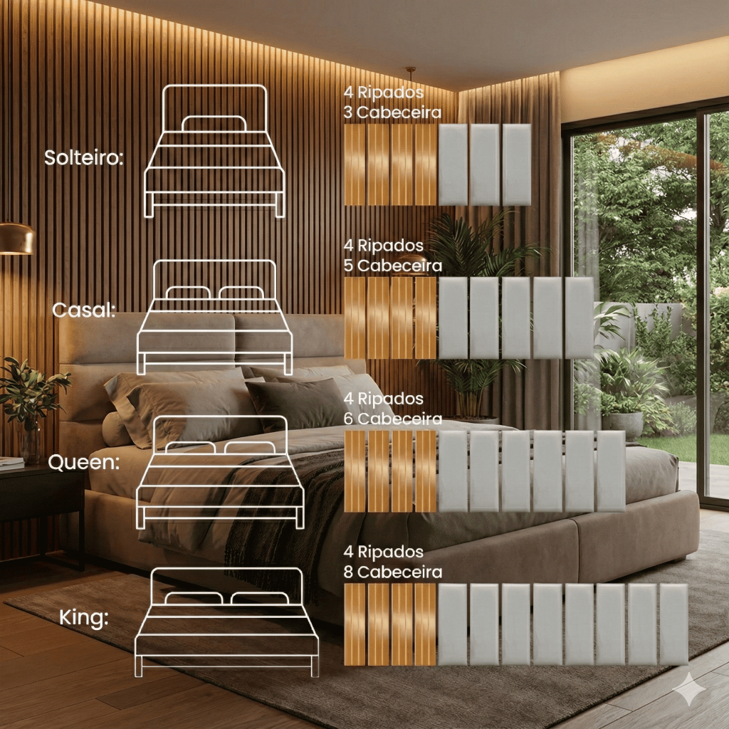 Kit 12 Placas de Cabeceira Modular Autocolante + Painel MDF Ripado Cama Casal King - ENVIO IMEDIATO