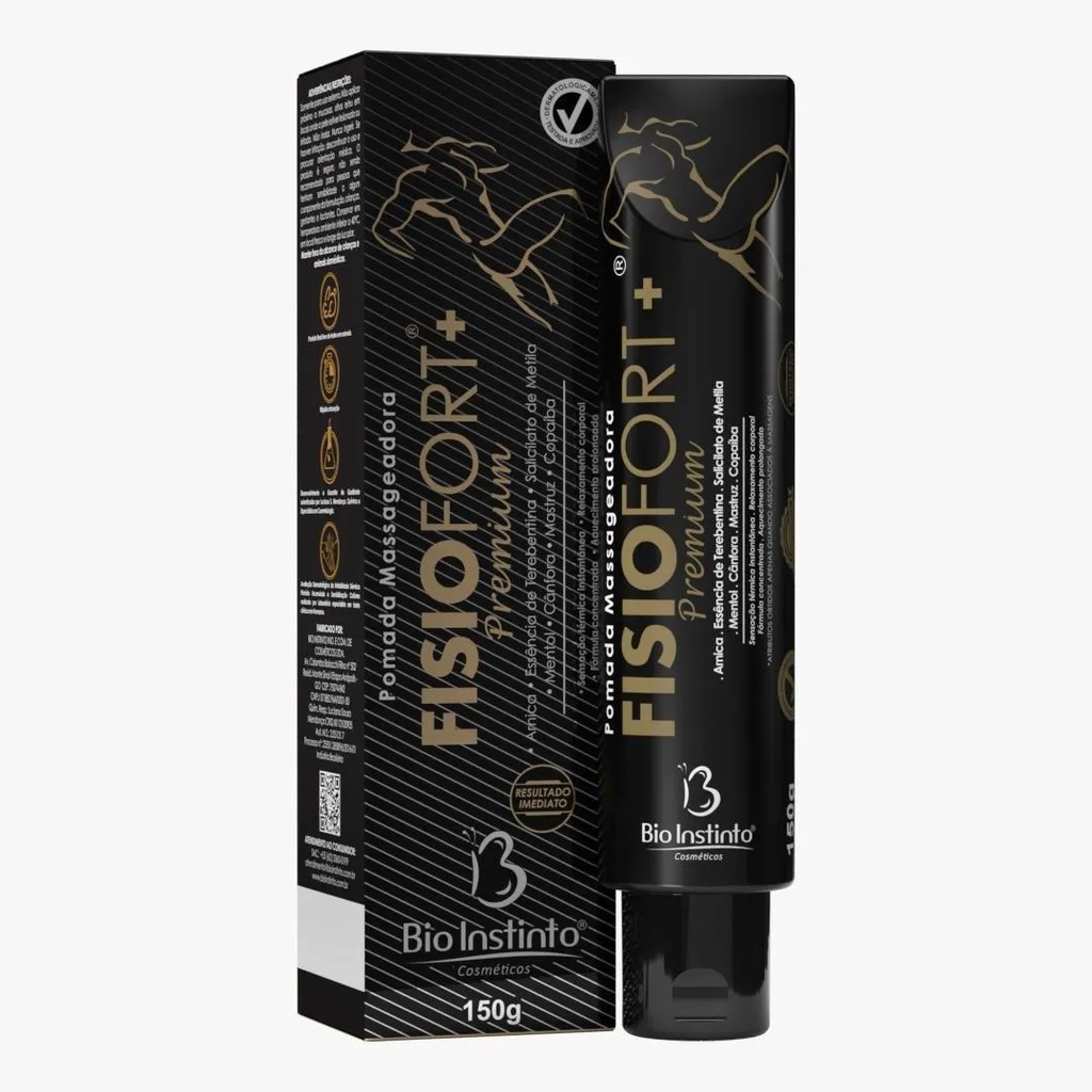 Kit 12 Pomada Massageadora Fisiofort Premium Preta - 150g - Bio Instinto Alivio Imediato.INDICAÇÕESIndicada para auxiliar no alívio da sensação de cansaço após desconfortos musculares.A Pomada Massageadora Fisiofort Premium melhora a circulação, é indicado para auxiliar no alívio da sensação de cansaço após desconfortos musculares.Melhora consideravelmente a flexibilidade dos músculos devido à sua composição rica em ingredientes rubefacientes que melhoram a circulação periférica e promovem o relaxamento e o conforto corporal.Dermatologicamente Testado e aprovado por Médico Dermatologista, e recomendado por Fisioterapeuta e Profissional de Ed. FísicaModo de usar: Aplicar no local desejado e massagear até a total absorção do produto na pele.Precauções: Não Ingerir. Manter fora do alcance de crianças e animais domésticos. Evite contato com os olhos, caso isso ocorra lavar abundantemente com água corrente. Não usar sobre a pele irritada ou lesionada. Se houver irritação da pele ou intoxicação suspender o uso imediatamente e procurar orientação médica.Uso Externo. Não utilizar durante a gravidez, não indicado para crianças.