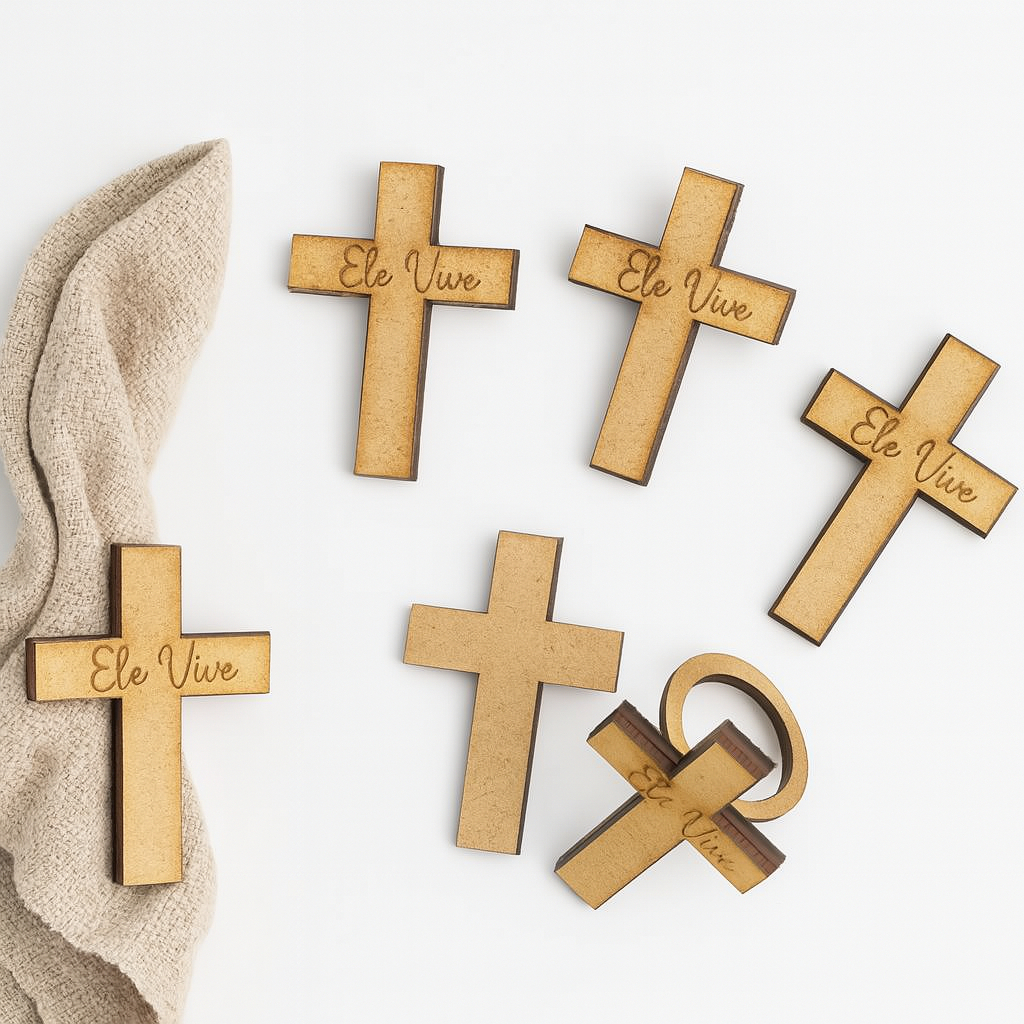Kit 12 Porta Guardanapo MDF Cruz com Gravação Ele Vive 6x4cm Decoração
