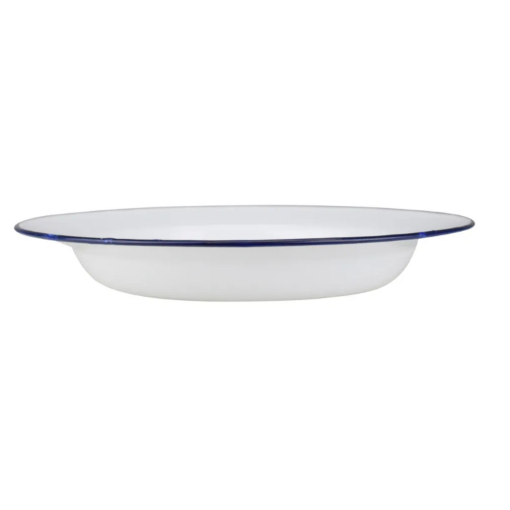 Características do Produto: Descrição: Prato fundo esmaltado, branco, com borda azul. Estilo: Linha retrô, trazendo uma sensação de aconchego e conexão com o passado. Material: Alumínio revestido de esmalte, que é rústico, durável e retém o calor por mais tempo. Dimensões: Diâmetro de 22 cm e altura de 3,5 cm. Peso: 95 g por unidade. Quantidade: Embalagem com 12 unidades. Observações Importantes: Por ser esmaltado e ter um acabamento rústico, os pratos podem apresentar características naturais do processo de fabricação, como: Pequenos descascados na pintura. Bolhas ou manchas suaves no esmalte. Amassados leves. Esses aspectos não são considerados defeitos, mas sim parte da estética e do processo de produção artesanal.