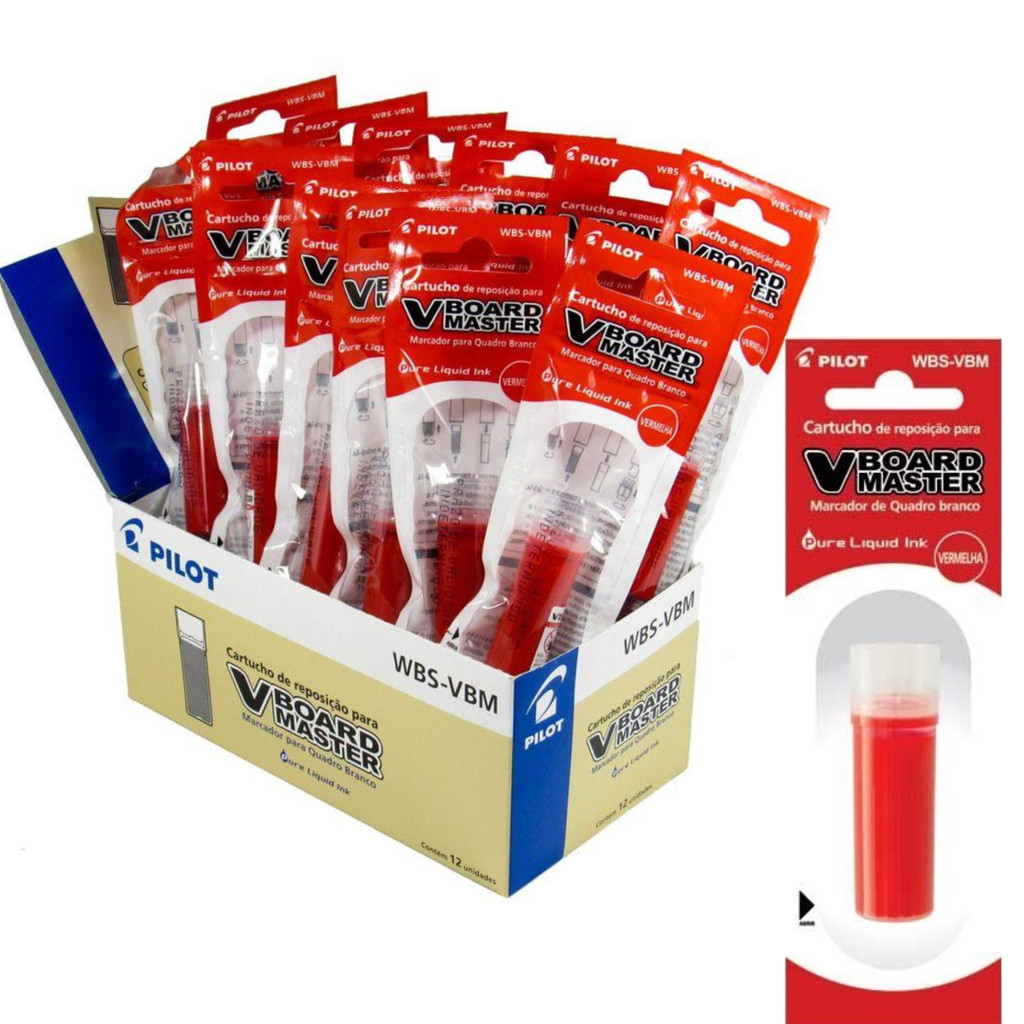Especificações técnicas: Referência: 2450006CX012VM; Marca: Pilot; Características do Produto: Refil Pilot WBS-VBM, tinta especial que dissolve em pó, não mancha as mãos nem o quadro branco. Recarga em cartucho, tinta em cores vivas; Embalagem: Caixa com 12 Unidades; Descrição: Ofereça aos seus clientes o refil para pincel de quadro branco vermelho da Pilot, em caixa com 12 unidades! Ideal para prolongar a vida útil dos pincéis, esse refil garante uma escrita vibrante e duradoura. Ofereça um produto prático e essencial que vai aumentar a conveniência e a satisfação dos seus clientes!