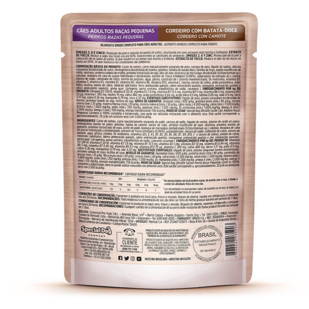 Kit com 12 Sachês Special Dog para Cachorros Adultos Raças Pequenas 100gr sabor Cordeiro e Batata-Doce Pet: Cachorro. Porte: Pequeno. Código de barras: 7898242035903 Benefícios para a Saúde da Pele e Pelagem: Proteção da pele, redução da queda de pelos e pelagem mais bonita. Complex Life: Potencializando a Saúde Geral Melhoria na digestão, fortalecimento do sistema imunológico, saúde óssea e dental, prevenção de cálculos renais. Uma Escolha Completa e Equilibrada: Sachê Special Dog oferece uma dieta deliciosa e saudável, proporcionando nutrição completa e benefícios específicos para uma vida saudável do seu cão. Quais os benefícios do Sachê Special Dog para Cachorros Adultos? O Sachê Special Dog para Cachorros Adultos Sabor Cordeiro é uma escolha deliciosa e saudável para tutores que buscam oferecer uma dieta balanceada aos seus cães. Com a combinação única de ômegas, zinco orgânico e o exclusivo Complex Life, este alimento úmido promove benefícios essenciais para a saúde dos pets. Benefícios para a Saúde da Pele e Pelagem A presença de ômegas e zinco orgânico no Sachê Special Dog contribui significativamente para a proteção da pele, redução da queda de pelos e melhoria na qualidade da pelagem. Esse conjunto de nutrientes é particularmente benéfico para cães com problemas de pele ou que enfrentam queda excessiva de pelos, proporcionando uma pelagem mais bonita e brilhante. Complex Life: Potencializando a Saúde Geral O Sachê Special Dog destaca-se pela inclusão do Complex Life, uma fórmula única composta por minerais orgânicos de fácil absorção. Esse complexo beneficia a saúde geral do cão, melhorando a digestão, fortalecendo o sistema imunológico, contribuindo para ossos e dentes saudáveis, e prevenindo a formação de cálculos renais. Uma Escolha Completa e Equilibrada Ao escolher o Sachê Special Dog para Cachorros Adultos Sabor Cordeiro, os tutores garantem uma nutrição completa e equilibrada para seus cães. A combinação cuidadosa de ingredientes de alta qualidade proporciona benefícios específicos, tornando este alimento úmido uma opção ideal para cães que buscam uma dieta saborosa e saudável. Enriquecimento por quilograma: Vitamina B1 12,5 mg, vitamina B2 5 mg, vitamina B3 10 mg, vitamina B5 6,84 mg, vitamina B6 5 mg, vitamina B7 0,05 mg, vitamina B9 0,5 mg, vitamina B12 25 µg, vitamina C 300 mg, vitamina D3 130 UI, vitamina E 20 UI, vitamina K3 1,8 mg, colina 480 mg, ferro 3,17 mg, iodo 0,9 mg, cobre 0,36 mg, manganês 0,79 mg, zinco 4,32 mg. Composição: Carne de ovinos, carne mecanicamente separada de aves, carcaça de aves, fígado de suínos, plasma sanguíneo desidratado de suíno, hemoglobina desidratada de bovino, gelatina, farinha de batata doce, farinha de trigo, amido modificado de milho, dextrose, proteína isolada de ervilha, proteína texturizada de soja, óleo de aves, biomassa de microalgas desidratada (Schizochytrium sp.), celulose, levedura de cana de açúcar hidrolisada e desidratada, extrato de Yucca schidigera, subproduto da extração da L-cistina, sulfato de glicosamina (0,05%), sulfato de condroitina (0,03%), cloreto de sódio, carbonato de cálcio, cloreto de potássio, água, glicina, cloridrato de L-cisteína monohidratado, DL-metionina, vitamina D3, vitamina E, vitamina K3, vitamina B1, vitamina B2, vitamina B6, vitamina B12, vitamina C, niacina, cloreto de colina, ácido pantotênico, ácido fólico, biotina, minerais (glicinatos: ferro aminoácido quelato, cobre aminoácido quelato, manganês aminoácido quelato e zinco aminoácido quelato), iodato de cálcio, goma guar, carragena, goma xantana, tripolifosfato de sódio, caramelo I.