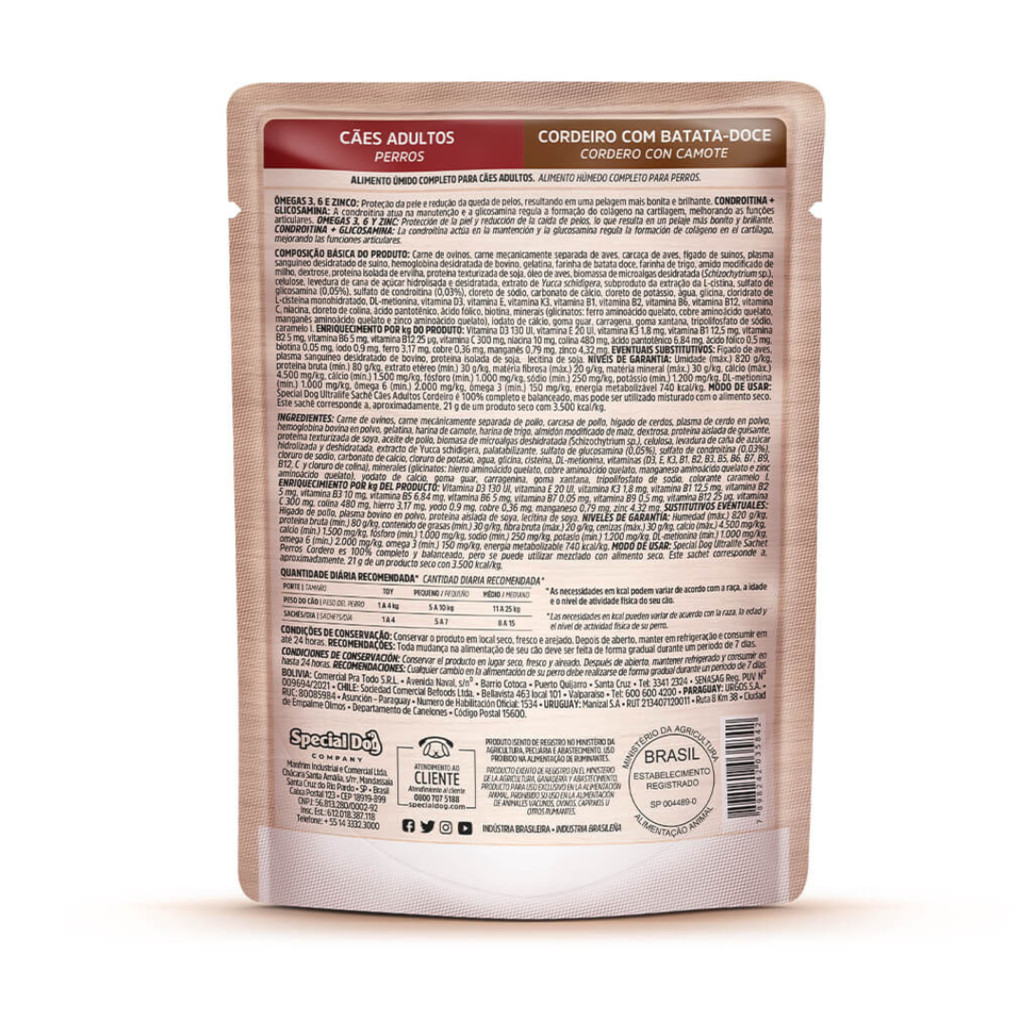 Kit com 12 Sachês Special Dog para Cachorros Adultos 100gr sabor Cordeiro e Batata-Doce Pet: Cachorro. Porte: Médio e grande. Código de barras: 7898242035842 Benefícios para a Saúde da Pele e Pelagem: Proteção da pele, redução da queda de pelos e pelagem mais bonita. Complex Life: Potencializando a Saúde Geral Melhoria na digestão, fortalecimento do sistema imunológico, saúde óssea e dental, prevenção de cálculos renais. Uma Escolha Completa e Equilibrada: Sachê Special Dog oferece uma dieta deliciosa e saudável, proporcionando nutrição completa e benefícios específicos para uma vida saudável do seu cão. Quais os benefícios do Sachê Special Dog para Cachorros Adultos? O Sachê Special Dog para Cachorros Adultos Sabor Cordeiro é uma escolha deliciosa e saudável para tutores que buscam oferecer uma dieta balanceada aos seus cães. Com a combinação única de ômegas, zinco orgânico e o exclusivo Complex Life, este alimento úmido promove benefícios essenciais para a saúde dos pets. Benefícios para a Saúde da Pele e Pelagem A presença de ômegas e zinco orgânico no Sachê Special Dog contribui significativamente para a proteção da pele, redução da queda de pelos e melhoria na qualidade da pelagem. Esse conjunto de nutrientes é particularmente benéfico para cães com problemas de pele ou que enfrentam queda excessiva de pelos, proporcionando uma pelagem mais bonita e brilhante. Complex Life: Potencializando a Saúde Geral O Sachê Special Dog destaca-se pela inclusão do Complex Life, uma fórmula única composta por minerais orgânicos de fácil absorção. Esse complexo beneficia a saúde geral do cão, melhorando a digestão, fortalecendo o sistema imunológico, contribuindo para ossos e dentes saudáveis, e prevenindo a formação de cálculos renais. Uma Escolha Completa e Equilibrada: Ao escolher o Sachê Special Dog para Cachorros Adultos Sabor Cordeiro, os tutores garantem uma nutrição completa e equilibrada para seus cães. A combinação cuidadosa de ingredientes de alta qualidade proporciona benefícios específicos, tornando este alimento úmido uma opção ideal para cães que buscam uma dieta saborosa e saudável. Por que comprar o Sachê Special Dog para Cachorros Adultos na Polipet? Na Polipet oferecemos ótimos preços em diversos produtos em nosso site, e você pode comprar através de boleto bancário ou cartão de crédito. Além de frete grátis sobre condições especiais para todo o Brasil. Além das opções de retire na loja e entregas locais no mesmo dia da compra. Consulte a nossa política de frete. Enriquecimento por quilograma: Vitamina B1 12,5 mg, vitamina B2 5 mg, vitamina B3 10 mg, vitamina B5 6,84 mg, vitamina B6 5 mg, vitamina B7 0,05 mg, vitamina B9 0,5 mg, vitamina B12 25 µg, vitamina C 300 mg, vitamina D3 130 UI, vitamina E 20 UI, vitamina K3 1,8 mg, colina 480 mg, ferro 3,17 mg, iodo 0,9 mg, cobre 0,36 mg, manganês 0,79 mg, zinco 4,32 mg. Composição: Carne de ovinos, carne mecanicamente separada de aves, carcaça de aves, fígado de suínos, plasma sanguíneo desidratado de suíno, hemoglobina desidratada de bovino, gelatina, farinha de batata doce, farinha de trigo, amido modificado de milho, dextrose, proteína isolada de ervilha, proteína texturizada de soja, óleo de aves, biomassa de microalgas desidratada (Schizochytrium sp.), celulose, levedura de cana de açúcar hidrolisada e desidratada, extrato de Yucca schidigera, subproduto da extração da L-cistina, sulfato de glicosamina (0,05%), sulfato de condroitina (0,03%), cloreto de sódio, carbonato de cálcio, cloreto de potássio, água, glicina, cloridrato de L-cisteína monohidratado, DL-metionina, vitamina D3, vitamina E, vitamina K3, vitamina B1, vitamina B2, vitamina B6, vitamina B12, vitamina C, niacina, cloreto de colina, ácido pantotênico, ácido fólico, biotina, minerais (glicinatos: ferro aminoácido quelato, cobre aminoácido quelato, manganês aminoácido quelato e zinco aminoácido quelato), iodato de cálcio, goma guar, carragena, goma xantana, tripolifosfato de sódio, caramelo I.