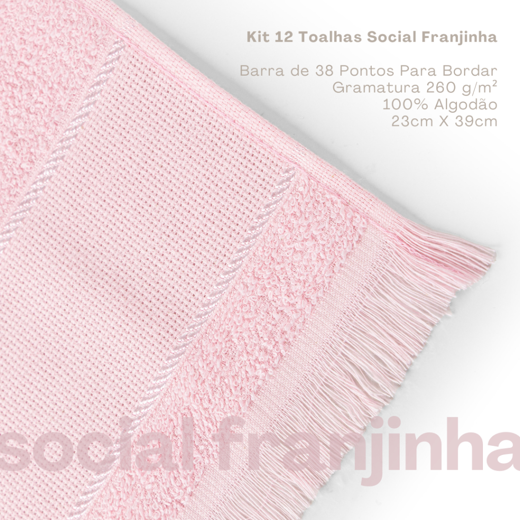 KIT DE 12 TOALHAS SOCIAL FRANJINHA Seu corpo felpudo com franjas, em 100% algodão, oferece toque macio, alta absorção e excelente durabilidade. Prática e multiuso, é ideal para lavabos, no carro, na bolsa, na lancheira, em viagens ou para presentear. Também possui barra especial para bordar com 38 pontos, perfeita para personalizações. Quantidade de Peças e Medidas Aproximadas (Largura x Comprimento): 12: Toalhinhas Felpudas de 23cm X 39cm Material e Composição: 100% Algodão gramatura 260 g/m² Informações Específicas: Toalha Hipoalergênica Lavar antes de usar pela primeira vez para retirada de resíduos de fabricação Não utilizar amaciantes nas primeiras lavadas Não usar alvejantes Cores escuras devem ser lavadas separadamente Evite lavar juntamente com tecidos abrasivos para evitar o surgimento de bolinhas Barra com 7,5 cm e 35 pontos para bordar Ideal para Personalização, Manicure e Pedicure, Academias, Lancheira de Crianças Informações Gerais: - Material visual ilustrativo; - Pode haver alterações na tonalidade da cor da imagem do produto, devido a diferença de telas de visualização; - Fique atento(a) à descrição do produto, podendo não apresentar todas as peças que constam no material visual; - Garantia contra defeito de fábrica A&B ENXOVAIS ENVIA TODOS OS PRODUTOS EM ATÉ 24 HORAS, TEMOS TODOS OS PRODUTOS EM ESTOQUE