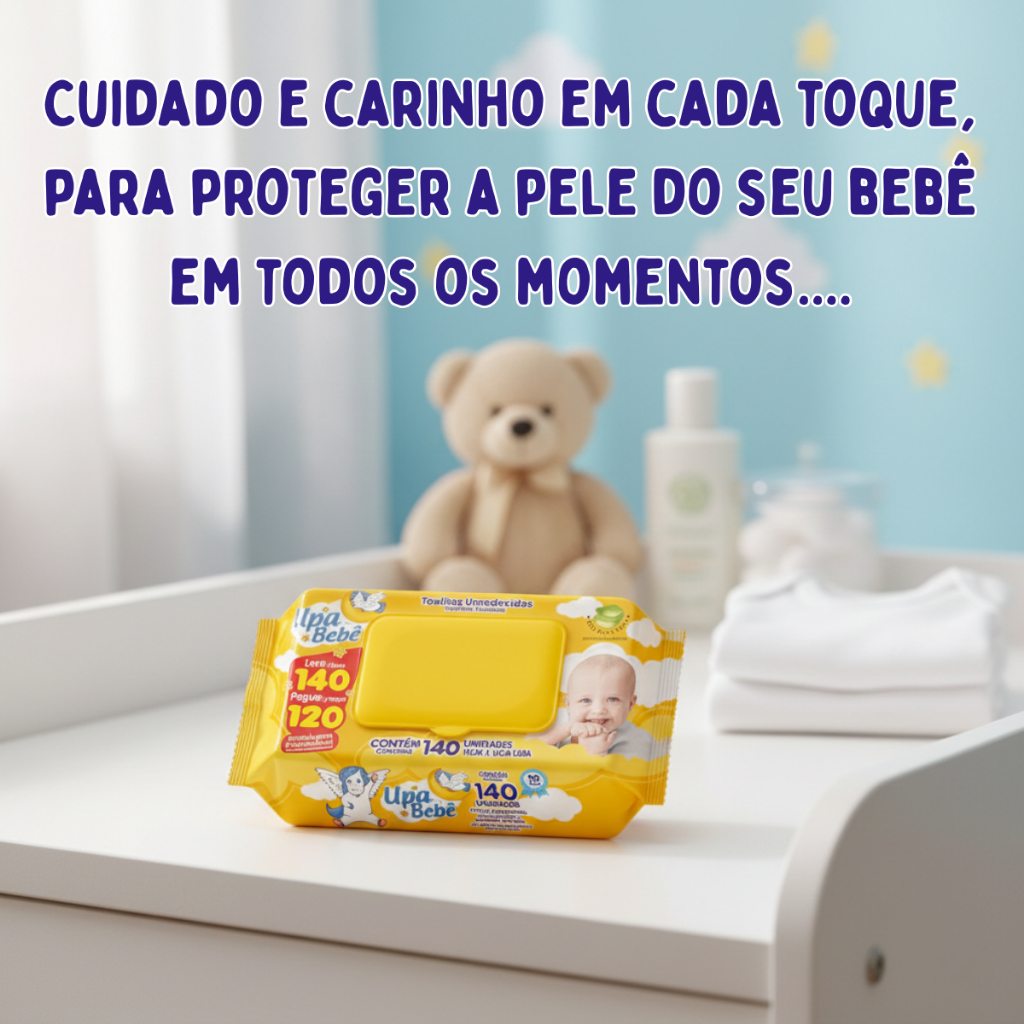 Kit 12 Toalhas Umedecidas Upa Bebê 140un – Mais Economia e Praticidade no Dia a Dia O Kit com 12 pacotes de Toalhas Umedecidas Upa Bebê é ideal para quem busca economia, rendimento e cuidado diário com o bebê. São 1680 lenços no total, perfeitos para manter a higiene infantil sempre prática e segura. ✔️ Benefícios e Vantagens • Alta quantidade: 12 pacotes com 140 unidades cada • Excelente custo-benefício para uso diário • Textura macia e suave ao toque • Ideal para higiene do bebê em casa ou passeios • Embalagem com tampa Flip Top que conserva a umidade ✔️ Diferenciais Técnicos • 140 lenços por pacote • Total de 1680 unidades no kit • Tampa Flip Top abre e fecha fácil • Embalagem prática e resistente • Desenvolvido para higiene infantil diária ✔️ Indicação de Uso Indicado para: • Troca de fraldas • Limpeza das mãos e rosto • Higiene após refeições • Uso em casa, creche, passeios e viagens Produto essencial para manter na bolsa do bebê, mochila maternidade ou estoque doméstico. ✔️ Economia Inteligente O formato em kit é ideal para famílias, creches ou para quem deseja comprar em maior volume com melhor custo-benefício. 4️⃣ PERGUNTAS E RESPOSTAS (FAQ) 1. O produto é original? Sim, trabalhamos apenas com produtos originais da marca Upa Bebê. 2. Quantas unidades vêm no kit? O kit contém 12 pacotes com 140 unidades cada, totalizando 1680 lenços. 3. As toalhas possuem tampa abre e fecha? Sim, todos os pacotes possuem tampa Flip Top para melhor conservação. 4. Pode usar em recém-nascido? É indicado para higiene infantil. Em caso de pele sensível, recomenda-se testar antes do uso contínuo. 5. A embalagem ajuda a manter a umidade? Sim, a tampa Flip Top reduz o ressecamento dos lenços. 6. É indicado para levar na bolsa maternidade? Sim, o tamanho é prático e ideal para uso diário e passeios. 7. O produto tem fragrância? Pode variar conforme lote. Consulte a descrição específica do anúncio. 8. O envio é rápido? O envio é realizado conforme o prazo informado na plataforma no momento da compra. 9. Pode ser usado para limpar mãos e rosto? Sim, é indicado para higiene diária do bebê. 10. Vem lacrado de fábrica? Sim, todos os pacotes são enviados lacrados.