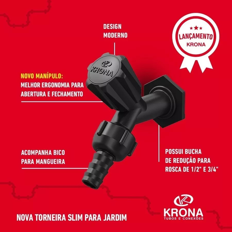 TORNEIRA KRONA PARA JARDIM COM ENCAIXES DE 1/2 E 3/4 POLEGADA KIT COM 12 UNIDADES MARCA: KRONA Produtos criados para integrar sistemas hidráulicos, interligando os pontos de espera aos aparelhos sanitários. Produzidos com alta tecnologia, qualidade e durabilidade, a linha de Acessórios KRONA é ideal para manter sua obra ainda mais resistente e completa. Os produtos desta linha são fabricados em PVC, PP e PEAD e seguem as determinações de normas brasileiras e internacionais. Esta linha é altamente testada, tornando-se a solução ideal para projetos residenciais, comerciais e industriais.