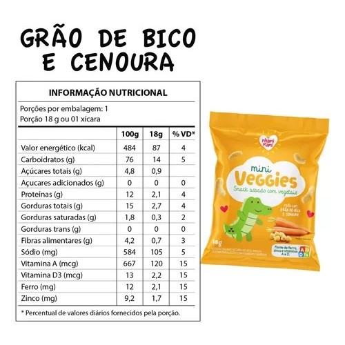 Snack Salgado Infantil - Assado com Vegetais Composição do Kit Kit completo com 12 unidades, divididas em 4 sabores diferentes: 3 unidades de Feijão e Cenoura 3 unidades de Ervilha e Brócolis 3 unidades de Lentilha e Brócolis 3 unidades de Grão de Bico e Cenoura Características Nutricionais Peso: 18g por unidade Tipo: Integral, assado com vegetais Diferenciais Nutricionais: Sem gordura trans Ingredientes naturais Não contém glúten Sem alergênicos (conforme RDC 26-15) Fonte de Ferro, Zinco e Vitaminas A e D Detalhamento dos Sabores Feijão e Cenoura Ingredientes: Farinha de Arroz Integral (35%) Farinha de Feijão Farinha de Arroz Óleo de Girassol Sal Marinho Cenoura em Pó Mix de Vitaminas e Minerais Ervilha e Brócolis Ingredientes: Farinha de Ervilha Farinha de Arroz Integral Farinha de Arroz Óleo de Girassol Brócolis em Pó Sal Marinho Mix de Vitaminas e Minerais Lentilha e Brócolis Ingredientes: Farinha de Arroz Integral (36%) Farinha de Lentilha Farinha de Arroz Óleo de Girassol Sal Marinho Brócolis em Pó Mix de Vitaminas e Minerais Grão de Bico e Cenoura Ingredientes: Farinha de Grão de Bico Farinha de Arroz Integral (31%) Farinha de Arroz Óleo de Girassol Cenoura em Pó Sal Marinho Mix de Vitaminas e Minerais Informações Adicionais Todos os sabores contêm: Mix de vitaminas e minerais Aroma natural Preparação assada Adequado para alimentação infantil Um snack nutritivo e saboroso para seu filho!