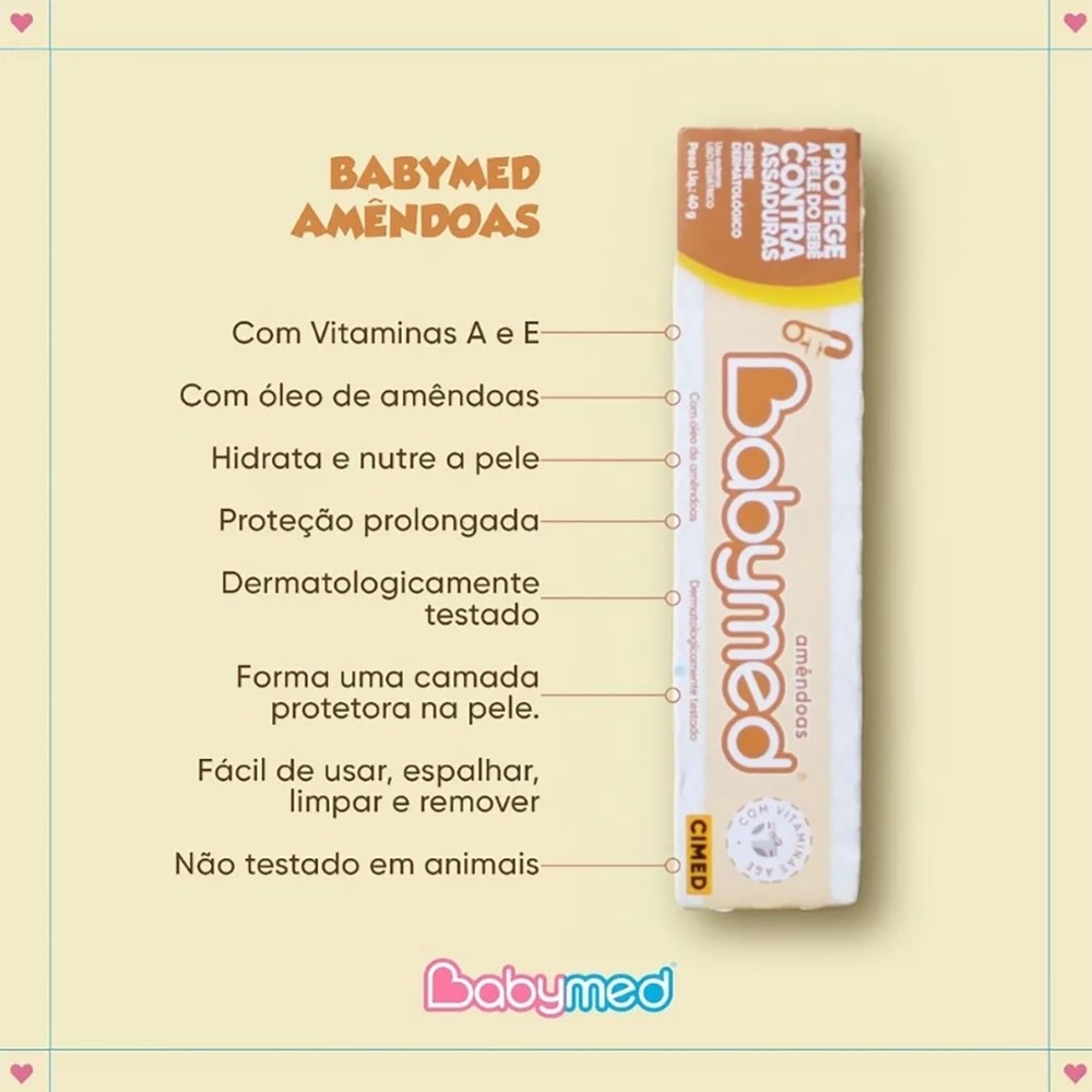 Kit 12 und Babymed Amêndoas 40g Babymed Amêndoas Pomada é ideal para proteger a pele irritada do bebê, além de prevenir as assaduras. Possui fórmula com Vitaminas A e E que ajudam a deixar a pele do seu bebê sempre hidratada e bem nutrida. É Fácil de usar, espalhar, limpar e remover! Uso externo, tópico e dermatológico.