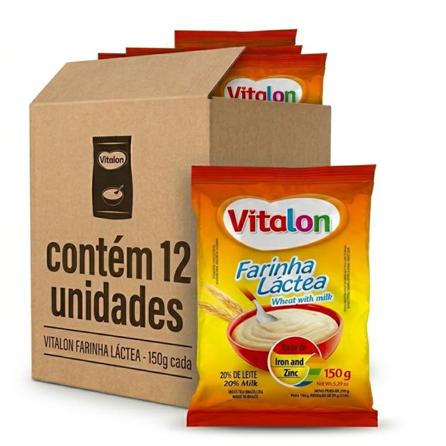 A Farinha Láctea Vitalon é sinônimo de sabor, nutrição e praticidade. Produzida com farinha de trigo e com um delicioso toque de leite tostado, é enriquecida com vitaminas e minerais essenciais para uma alimentação equilibrada. Ideal para todas as idades, é perfeita para o café da manhã ou lanches ao longo do dia. A Farinha Láctea Vitalon Tradicional é feita com farinha de trigo e um delicioso sabor de leite tostado, que agrada a todas as idades. Fonte de vitaminas e minerais, é uma opção nutritiva e prática para o café da manhã ou lanche. Com preparo rápido e textura cremosa, é perfeita para quem busca sabor, energia e nutrição em uma única colherada. Disponível em diversos tamanhos para atender a diferentes necessidades, desde o consumo individual até embalagens econômicas para a família toda. Destaques do Produto: Sabor de leite tostado irresistível Fonte de vitaminas e minerais Fácil preparo Validade de 16 meses Caixa com 12 unidades de 150g cada Fonte de Ferro e Zinco