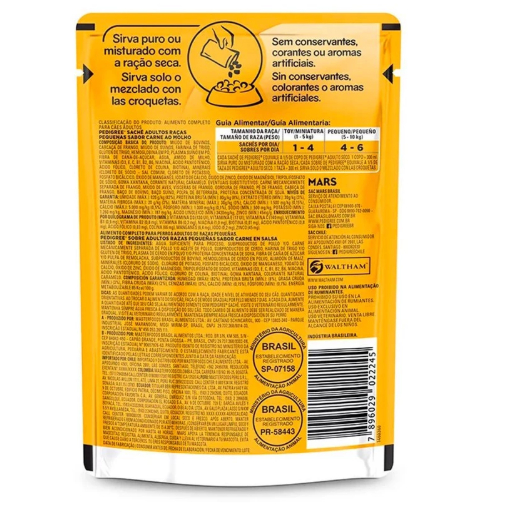 - Indicado para cães; - Para cães de porte pequeno; - Refeição 100% completa; - Balanço ideal de fibras; - Sem conservantes, sem corantes e sem aromas artificiais. Ração Úmida Cães Adultos Raças Pequenas é um o delicioso sachê PEDIGREE. Um alimento 100% completo e balanceado, feito com Vitamina E que ajuda o sistema imune e contém ingredientes de alta qualidade para manter o seu cão feliz e saudável. Também não contém conservantes, sabores e aromas artificias. Ração úmida Pedigree um alimento 100% completo e balanceado, contém Vitamina E que ajuda a manter uma vida saudável, auxilia no balanço ideal de fibras. Modo de usar Cães de 1kg a 5kg: 1 a 4 sachês por dia Cães de 5kg a 10 kg: 4 a 6 sachês por dia Ingredientes Miúdo de bovino, carcaça de frango, miúdo de suíno, farinha de trigo, glúten de trigo, hemoglobina em pó, plasma suíno em pó, fibra de cana-de-açúcar, água, amido de milho, tripolifosfato de sódio, goma xantana, corante natural caramelo. Eventuais substitutivos: Carne mecanicamente separada de frango, miúdo de ave, vísceras de frango, gordura de frango, pé de frango, cabeça de frango, baço de bovino, baço suíno, polpa de beterraba, proteína concentrada de soja. D3, E, C, B1, B2, B6, niacina, ácido pantotênico, ácido fólico, cloreto de colina, biotina Cloreto de sódio – sal comum, cloreto de potássio, fosfato bicálcico, óxido de manganês, iodato de cálcio, óxido de zinco, óxido de magnésio