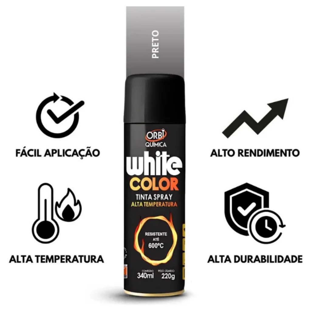 ⚠️ IMPORTANTE: ESTA TINTA NÃO DEVE SER APLICADA EM ÁREAS QUE TENHAM CONTATO DIRETO COM FOGO OU ALIMENTOS. Indicada para parte externas de fogões, fornos, lareiras, churrasqueiras, grelhas, escapamentos e peças automotivas, esta tinta spray renova o aspecto das superfícies metálicas e aumenta a sua vida útil. O produto é fornecido em embalagem nova e lacrada, pronto para uso. A Tinta Spray Alta Temperatura é a solução ideal para quem busca proteção, durabilidade e acabamento profissional em superfícies expostas ao calor. Desenvolvida para suportar até 600 °C, garante excelente resistência térmica, protegendo contra ferrugem e desgaste mesmo em condições extremas. Sua fórmula de alta aderência proporciona cobertura uniforme, secagem rápida e fácil aplicação, permitindo um resultado de qualidade em pouco tempo. Com a Tinta Spray Alta Temperatura você transforma, protege e valoriza seus projetos, alcançando um acabamento resistente e duradouro com praticidade e confiança. Modo de usar: limpe bem o local a ser aplicado o produto, eliminando qualquer sujeira como poeira, ferrugem, óleo ou graxa. Em seguida, aplique a tinta de forma uniforme conforme a necessidade da superfície. Atenção: após a aplicação da Tinta Alta Temperatura, a superfície deve ser submetida ao aquecimento de 250 °C por 1 hora. Somente após esse processo de cura o revestimento terá resistência completa para suportar temperaturas de até 600 °C. 340 ML
