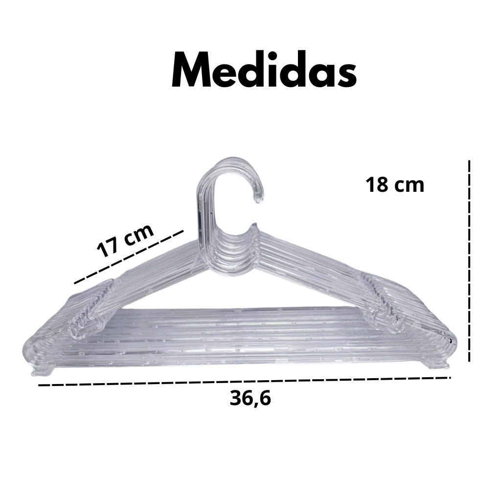 Kit cabides cristal reforçado Cansado de roupas amassadas e guarda-roupa bagunçado? Apresentamos nossos cabides de plástico transparente reforçado, a solução perfeita para organizar suas peças com elegância e praticidade! Com design moderno e discreto, esses cabides valorizam suas roupas e se integram perfeitamente a qualquer estilo de armário.São ideais para otimizar o espaço, mantendo suas peças favoritas sempre à vista e impecáveis. Medindo 36,6 cm de comprimento por 18 cm de altura Por que escolher nossos cabides transparentes reforçados? Durabilidade Superior: Fabricados com plástico de alta qualidade e reforçados, garantem resistência extra para suportar desde roupas leves até peças mais pesadas sem deformar. Diga adeus aos cabides frágeis que quebram facilmente! Design Transparente: A transparência do material oferece um visual limpo e minimalista, realçando suas roupas e facilitando a visualização de tudo o que você tem no guarda-roupa. Encontre o que precisa em segundos! Otimização de Espaço: Seu formato inteligente permite organizar suas roupas de forma mais eficiente, liberando espaço valioso no seu armário. Tenha um guarda-roupa mais espaçoso e funcional. Versatilidade: Perfeitos para blusas, camisas, vestidos, saias e muito mais! Adaptam-se a diversas peças do seu vestuário, mantendo-as sempre bem cuidadas e prontas para usar. Invista em organização e preserve suas roupas com a qualidade que elas merecem. Adquira já seus cabides de plástico transparente reforçado e transforme seu guarda-roupa!