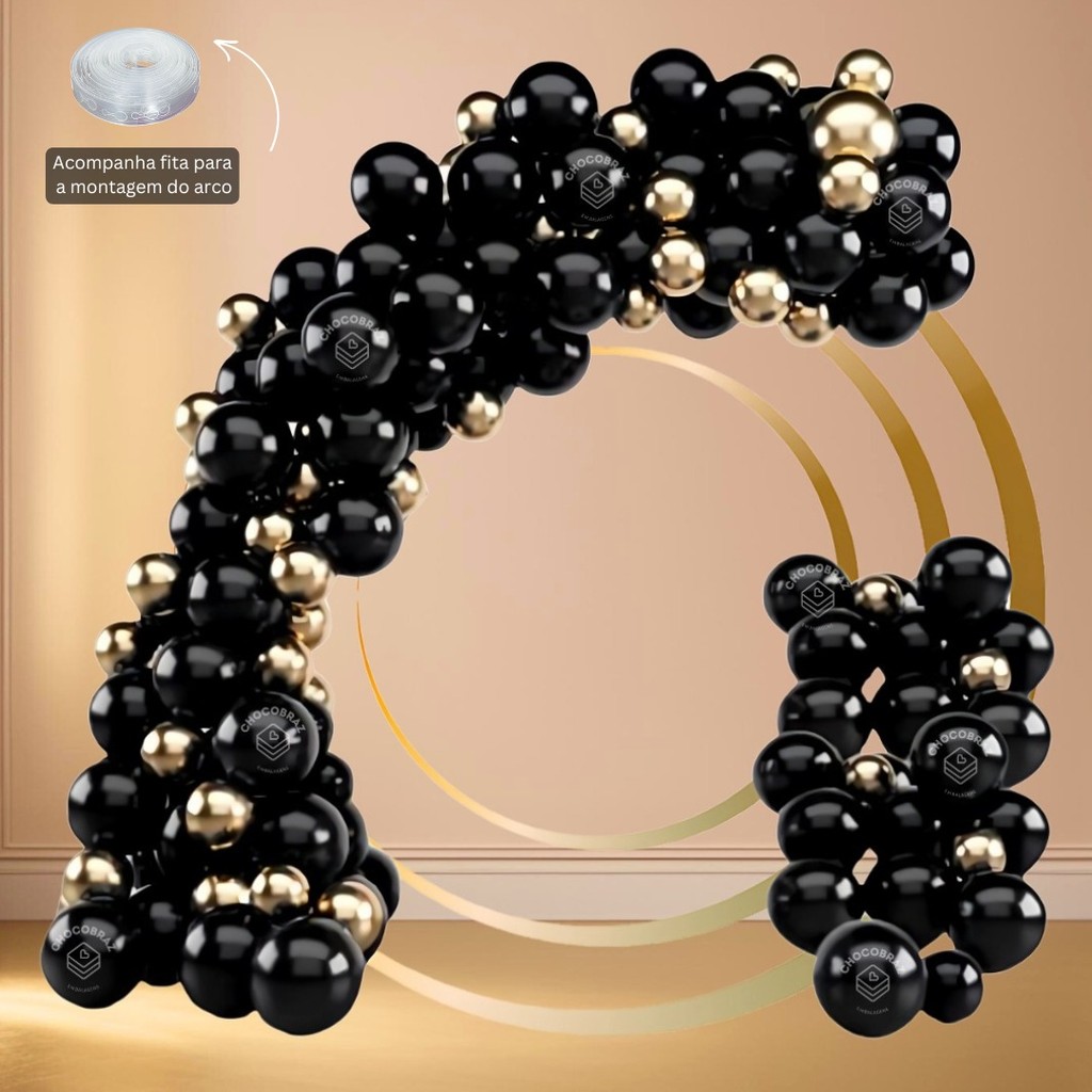 QUANTIDADE - 2 Pacote com 50 unidades PRETO 7 Polegadas TOTAL 100 - 1 Pacote com 25 unidades DOURADO CROMADO 5 Polegadas Total: 125 unidades 1 ROLO DE FITA ARCO DESCONTRUIDO 5 METROS TAMANHO - Tamanho: 7" polegadas (18cm de Diâmetro - Cheio) - Tamanho: 5" polegadas (13cm de Diâmetro - Cheio) DETALHES DO PRODUTO - Marca HAPY DAY - Modelo Liso/Cromado - Material Látex - Linha Profissional - Brilho Intenso - Cores Vibrantes - Não Solta Tinta