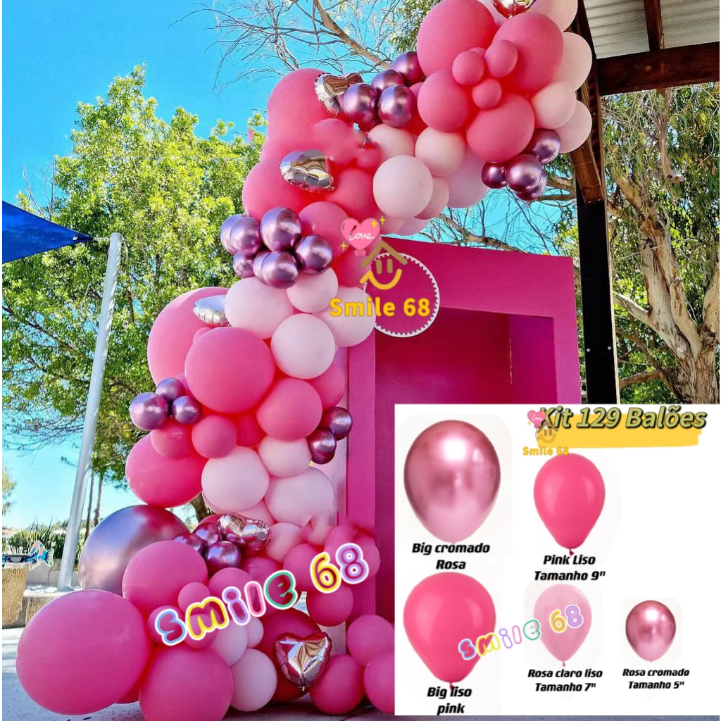 | Kit 129 Balões Bexiga Liso Pink 9" + Rosa claro 7" + Rosa Cromado 5... este produto | R$ 49,90 | — | 4.9/5 | 3 |