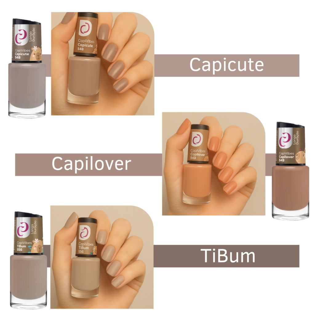 Encante-se com a Coleção CapiVibes da Cora, um kit exclusivo com 13 esmaltes em tons nude, inspirado no charme e serenidade das capivaras! Perfeito para quem ama unhas sofisticadas, modernas e com longa duração. Cada cor traz um tom único, que vai desde os nudes claros e delicados, até os terrosos intensos e marcantes, ideais para todas as ocasiões — do dia a dia ao look mais elegante. Tons incluídos: Capi Glow Vixe Capixe CapiBaby Tô de Boas Capicute CapiLover TiBum Capimigas Tô Nem Aí Capixonei Ronquinho CapiCrazy Tô Plena Benefícios: Longa duração Cobertura uniforme Secagem rápida Fórmula vegana e 6FREE (livre de substâncias agressivas) Cores modernas e versáteis Transforme suas unhas com a coleção que une estilo, cuidado e personalidade em cada vidrinho!