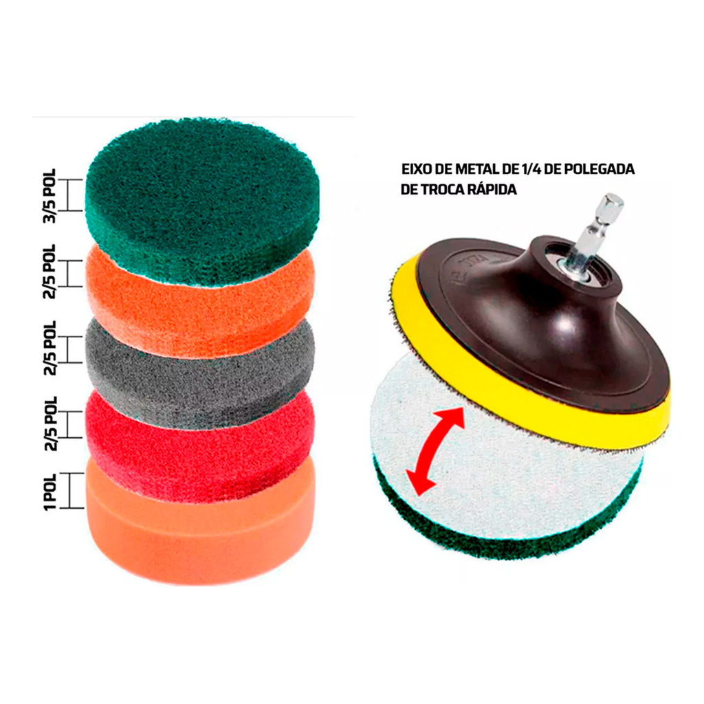 Distribuído por Ismafer Ferramentas CW200 - Kit acessório limpeza 14 pcs O Kit acessório limpeza 14 pcs Oz possui escovas ideais que combinadas à ação giratória de uma parafusadeira por exemplo, aumentam o poder de limpeza e proporcionam uma grande economia de tempo. Suas cerdas são feitas de nylon durável para esfregar forte e durarem mais. Além das escovas, o kit possui esfregões/esponjas que auxiliam na limpeza e brilho. Especificações Técnicas: 4 Escovas 1 Base para esfregões / esponja 1 Extensor de 150mm 2 Esponjas de 5"" 6 Esfregões de 5"" Garantia: 3 meses pelo fornecedor EAN: 7898722071681 SKU: 21237 Distribuído por Ismafer Ferramentas