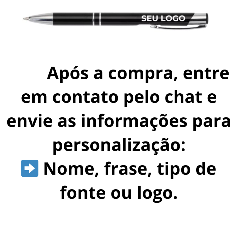 Canetas Metálicas Personalizadas com Nome Logo ou Frase Destaque sua marca, presenteie clientes ou torne seu evento ainda mais especial com nossas canetas metálicas personalizadas! Elegantes, resistentes e com gravação a laser permanente, elas unem qualidade e sofisticação em cada detalhe. 💙 Características do produto: Caneta metálica com carga esferográfica azul Sistema de acionamento por clique Gravação a laser (não sai e não desbota) Personalização com nome, frase, logo ou desenho ⚙️ Como Personalizar Sua Caneta 1️⃣ Após a compra, entre em contato pelo chat e envie as informações para personalização: ➡️ Nome, frase, tipo de fonte (modelos disponíveis nas fotos) ou logo. 2️⃣ Logo personalizada? 📎 É necessário enviar o arquivo vetorizado (.cdr, .ai, .svg ou .pdf vetorizado). ➡️A personalização da caneta é única para todo o pedido. Não fazemos nomes individuais em um mesmo kit. Para personalizações diferentes (nomes variados), compre nos outros anúncios da nossa loja. 3️⃣ Sem quantidade mínima! Ideal tanto para brindes empresariais quanto para uso pessoal. 4️⃣ Atenção ao prazo: ⏰ Caso as informações não sejam enviadas em até 2 dias úteis após a compra, o produto será enviado sem personalização. 5️⃣ Grandes quantidades? Entre em contato pelo chat para receber um link personalizado e condições especiais. 6️⃣ Evite atrasos! Envie todas as informações de forma organizada e completa — isso ajuda nosso time de designers a realizar sua personalização com agilidade e precisão. 🎁 Perfeitas para: ✔️ Brindes corporativos ✔️ Eventos, feiras e formaturas ✔️ Presentes personalizados ✔️ Uso profissional e pessoal