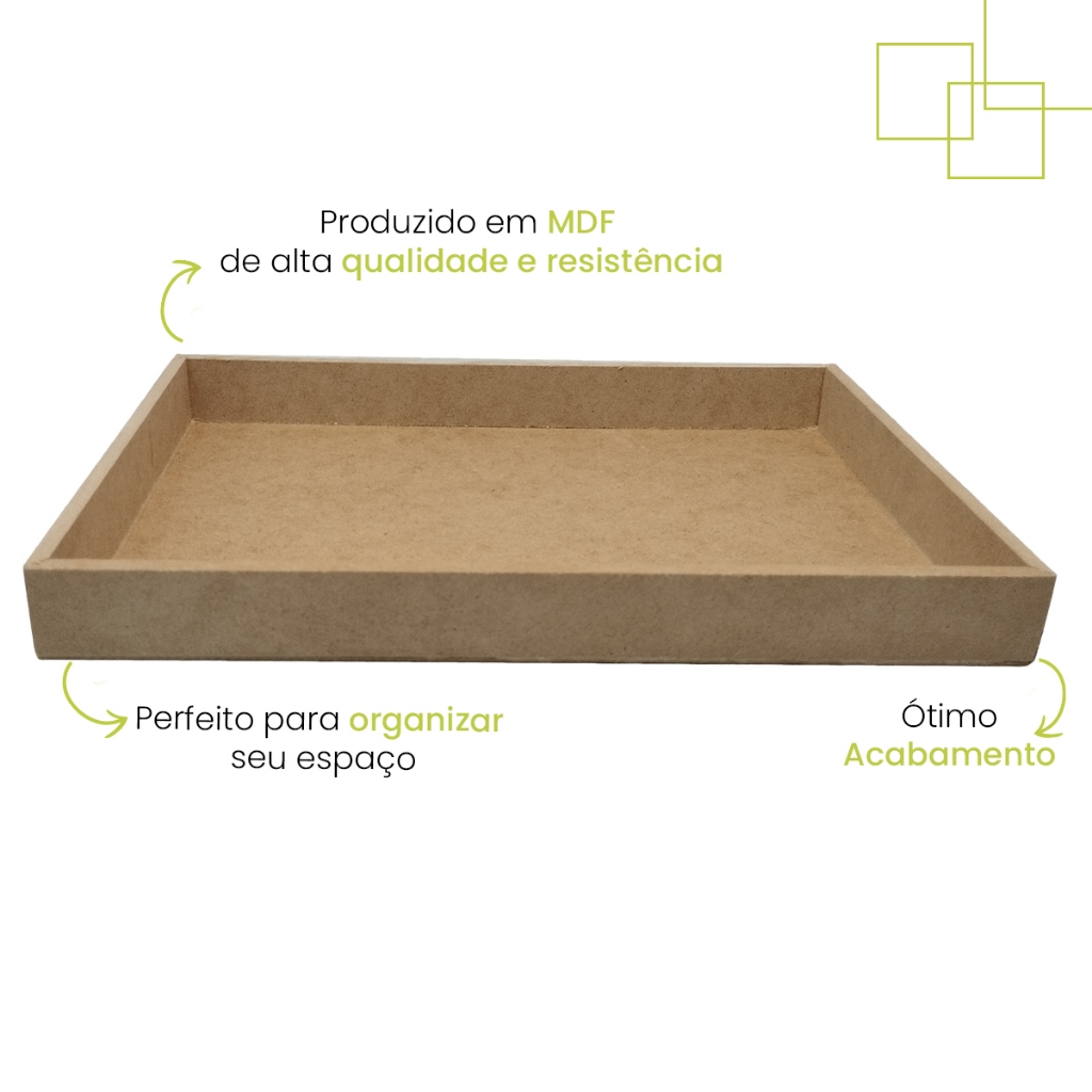 KIT 15 BANDEJAS RETANGULARES RETA EM MDF 30X20X3 As bandejas possui um design elegante e proporciona praticidade no dia a dia para dispor itens e organizar seu cantinho. Excelente e sofisticadas para compor a decoração do seu espaço. Também são muito utilizadas na organização de banheiros e lavabos, deixando visível sabonete, cotonete, papel e toalhas, para mais fácil manuseio. Sirva com criatividade! Medidas: Comprimento: 30 cm Largura: 20 cm Altura: 3 cm FICHA TÉCNICA: Espessura: 3 mm Material: MDF - KIT COMPOSTO POR 15 BANDEJAS DE TAMANHOS IGUAIS 30X20X3). - BANDEJAS FEITAS EM MDF CRU DE ALTA DURABILIDADE. - POR SER FEITO DE FORMA ARTESANAL, PODE CONTER PEQUENA DIFERENÇA NO TOM DO MDF CRU E ATÉ 1,0 NA MEDIDA FINAL. * FOTOS AMBIENTADAS MERAMENTE ILUSTRATIVA. - Como cuidar da sua peça em MDF cru? Proteja-o da umidade e calor excessivo; remova a poeira da superfície utilizando um pano macio e seco ou espanador de pó; evite utilizar produtos que contenham solventes, abrasivos ou amônia. - Confira nossos demais produtos com essa e outras finalidade, clicando em " Ver mais anúncios do vendedor" e acompanhe nossos lançamentos. - Tem alguma dúvida? Faça uma pergunta abaixo! Nossa equipe está pronta para atendê-lo, tirando qualquer dúvida e garantindo satisfação na sua compra. Os acessórios em MDF e madeira PINUS da Expresso da Madeira possuem um design diferenciado que combina modernidade e sofisticação, proporcionando um toque de elegância e beleza para sua casa. Aguardamos seu pedido! Boas compras! Expresso da Madeira