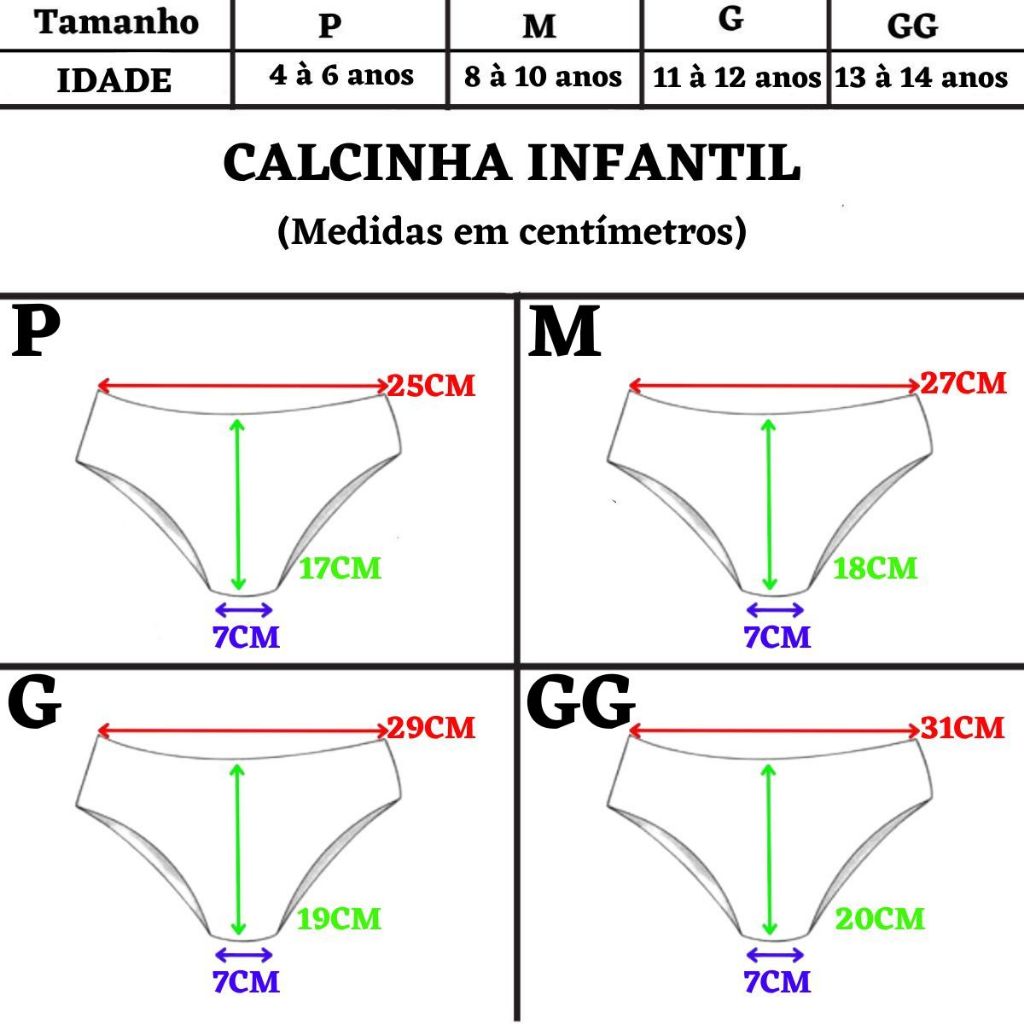 Kit com 15 peças... As calcinhas são confeccionadas em tecido de microfibra de ótima qualidade. SOBRE OS TAMANHOS P, veste 4 a 6 anos M, veste 8 a 10 anos G, veste 11 a 12 anos GG, veste 13 a 14 anos Tamanho P: 25cm (Podendo esticar até 42cm). Tamanho M: 27cm (Podendo esticar até 45cm). Tamanho G: 29cm (Podendo esticar até 48cm). Tamanho GG: 31cm (Podendo esticar até 50cm). Para mais de um tamanho no kit, logo após a compra informe no campo de mensagem. ... COMPOSIÇÃO TECIDO 90% POLIESTER 10% ELASTANO COMPOSIÇÃO DO FUNDO 100% Algodão SOBRE O KIT As calcinhas tem uma média de cinco estampas diferentes Atenção; as estampas podem sofrer alterações devido a rotatividades do produto as fotos são ilustrativas para divulgação do produto as estampas são trocadas semanalmente