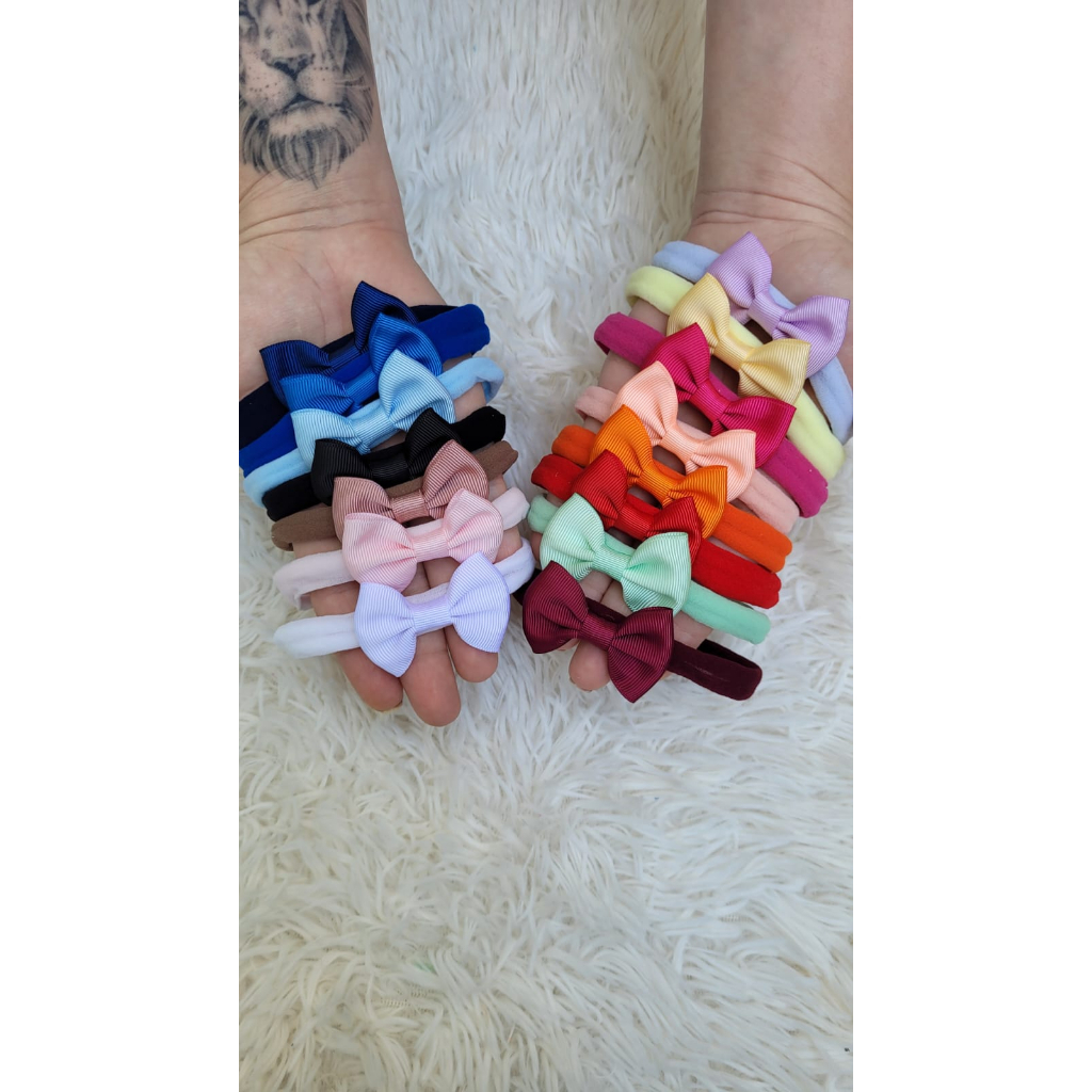 Detalhes* kit promocional tempo limitado * VALOR REFERENTE A 15 UNIDADES! * Super confortáveis e adaptáveis as faixinhas servem de RN a 2 anos! * As cores são :BRANCO, ROSA BEBÊ, ROSA PINK, VERDE AGUA, AMARELO BEBE, AZUL BEBE, LILÁS, LARANJA, VERMELHO, PRETO, SALMÃO, MARSALA, AZUL MARINHO, NUDE ROSADO, AZUL ROYAL. *Não podendo haver alterações. *Podem haver alterações da cor dependendo da revolução da tela que é visualizada. *Tamanho lacinho: 4cm largura por 6cm comprimento aproximadamente OBS. No caso de não haver uma cor da laço idêntica as que estão no kit, será alterada para uma outra cor, mas que será diferente das demais, não havendo cores repetidas. *Feito de mãe pra mãe artesanalmente com muito carinho ♡