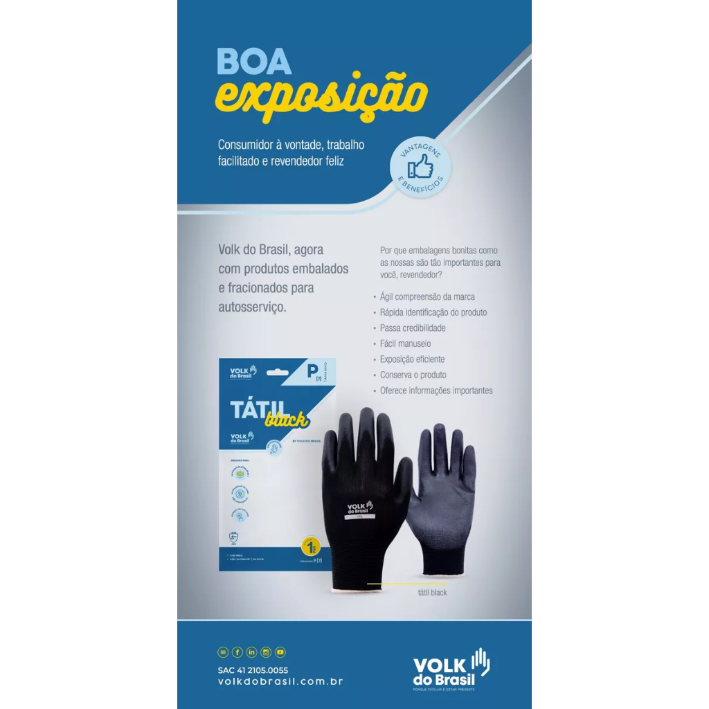 CA 30916 / CA 50659 Kit 15 Luva Tatil Volk Multitato Luva PU Banho Poliuretano Mecânico Antiestática Manutenção Obras Segurança e Precisão em Todas as Tarefas! Apresentamos o Kit 15 Luva Tatil Volk Multitato Luva PU Banho Poliuretano Mecânico Antiestática Manutenção Obras, a escolha perfeita para profissionais que buscam qualidade, proteção e conforto em suas atividades diárias. Essas luvas são ideais para uma ampla gama de aplicações, desde manutenção e construção até trabalhos mecânicos e elétricos. CARACTERÍSTICAS PRINCIPAIS: Material de Alta Qualidade: Confeccionadas em poliuretano (PU), proporcionando resistência e durabilidade excepcionais; Design Multitato: Sensibilidade tátil aprimorada para trabalhos que exigem precisão, como manuseio de ferramentas e pequenos componentes; Banho de Poliuretano: Revestimento completo em PU que oferece proteção contra abrasões, cortes e perfurações, garantindo segurança máxima; Antiestática: Propriedades antiestáticas que protegem contra descargas eletrostáticas, essenciais para trabalhos com componentes eletrônicos; Conforto Ergonômico: Design anatômico que se ajusta perfeitamente às mãos, garantindo conforto durante o uso prolongado. BENEFÍCIOS: Proteção Superior: Revestimento em PU resistente a abrasões, cortes e perfurações, oferecendo segurança completa para suas mãos; Alta Sensibilidade: Design multitato que mantém a sensibilidade tátil, permitindo manuseio preciso e eficiente de ferramentas e componentes; Segurança Antiestática: Propriedades antiestáticas que previnem descargas eletrostáticas, essenciais para trabalhos em ambientes sensíveis a eletricidade; Durabilidade: Materiais de alta qualidade que garantem longa vida útil, mesmo em condições de trabalho exigentes; Versatilidade: Ideal para uma ampla gama de aplicações, incluindo manutenção, obras, mecânica, construção civil e eletricidade. APLICAÇÕES IDEAIS: Manutenção Geral: Perfeitas para técnicos e profissionais de manutenção que necessitam de proteção e sensibilidade; Construção Civil: Ideais para operários e engenheiros que trabalham em ambientes de construção, oferecendo segurança e conforto; Trabalhos Mecânicos: Essenciais para mecânicos e técnicos que lidam com peças e ferramentas pequenas, onde a precisão é fundamental; Eletricidade e Eletrônica: Propriedades antiestáticas que garantem segurança ao trabalhar com componentes eletrônicos e elétricos; Uso em Obras: Garantem proteção e eficiência em diversas atividades dentro de obras e construções. Com o Kit 15 Luva Tatil Volk Multitato Luva PU Banho Poliuretano Mecânico Antiestática Manutenção Obras, você tem a garantia de segurança, durabilidade e conforto em todas as suas tarefas. Não comprometa a qualidade do seu trabalho. Adquira agora mesmo na Shopee e equipe-se com o melhor! Garanta já o seu Kit e eleve a qualidade do seu trabalho com segurança e precisão! CA 30916/ CA 50659 RESISTÊNCIA MECÂNICA – EN388 – Desempenho 3121A; Tamanhos: 7(P) 8(M) 9(G) 10(EG); Uso: Reutilizável; Formato: Anatômico; Estrutura: Suporte Têxtil; Modelo da Estrutura: Tricotado; Material Suporte: Poliamida; Punho: Tricotado; Grip: Liso. Luva de segurança confeccionada em fibras sintéticas, revestimento da face palmar e ponta dos dedos em poliuretano (PU), punho com inserções de fibras elásticas e acabamento em fibras sintéticas. Indicada para trabalhos de precisão que exijam alta destreza e sensibilidade tátil em montagem e manutenção, inspeção de qualidade, montagem de embalagens, logística, montagem de sistemas não energizados, circuitos e painéis, manuseio de peças pequenas e outras.
