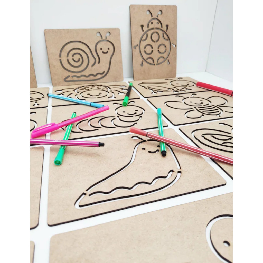 Kit 15 Moldes Infantil Insetos em MDF 3mm Cru com Caixa Canetinha para Desenhos Crianças