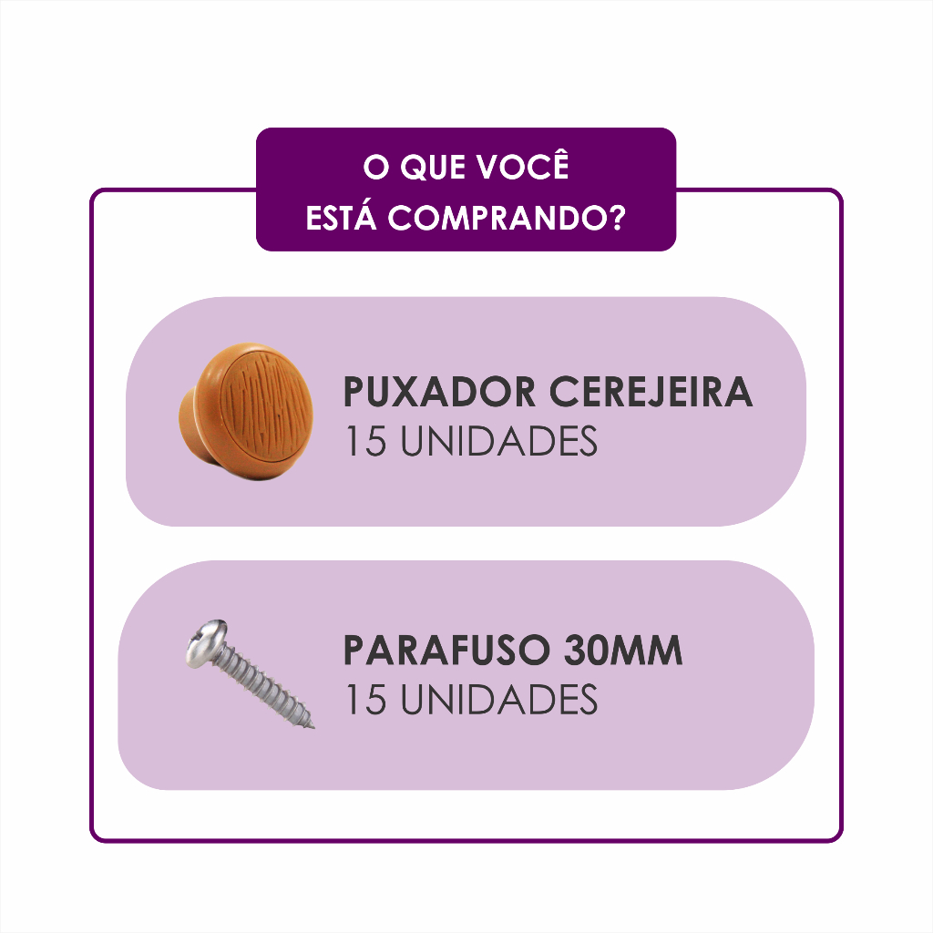 Puxador redondo de plástico, na cor Cerejeira, muito usado em móveis em série. Pode ser usado em gavetas e portas. Acompanha parafusos de fixação com 3cm de comprimento. INFORMAÇÕES TÉCNICAS Tipo: Puxador para móveis Material: Plástico Cor: Cerejeira Conteúdo da embalagem: 15 Puxadores Peso líquido aproximado do produto (kg): 25g Peso líquido aproximado do kit (kg): 250g