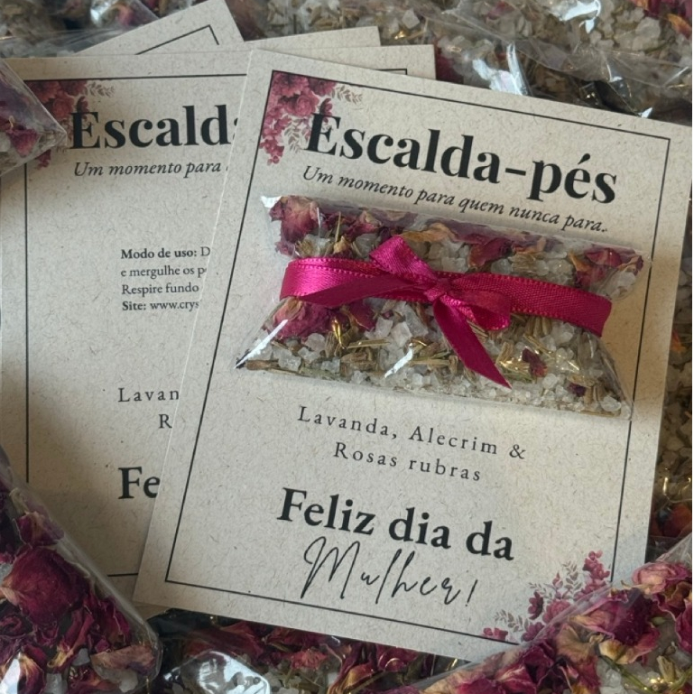 Celebre o Dia da Mulher com um gesto simples, delicado e cheio de cuidado. O Kit Escalda-Pés Lavanda, Alecrim & Rosas Rubras – 25g foi criado para proporcionar um momento de descanso real: aroma floral suave, toque herbal refrescante e pétalas naturais que transformam a água em um ritual de bem-estar. É a lembrancinha ideal para empresas, escolas, clínicas, eventos e ações especiais: elegante, pronta para presentear e com aquele toque de autocuidado que faz diferença na rotina. Destaques do kit: • Combinação relaxante de Lavanda, Alecrim & Rosas Rubras • Sachê de 25g, perfeito para brindes e kits corporativos • Aroma equilibrado: calmante + revitalizante • Visual delicado e feminino, ideal para o Dia da Mulher • Fácil de usar: basta dissolver na água morna e aproveitar o momento Proporcione uma pausa doce, leve e acolhedora — um presente simples, bonito e memorável para quem você quer homenagear no Dia da Mulher. Inclui tag em papel reciclado 180g (textura fosca) e laço rosa decorativo, garantindo um acabamento elegante e pronto para presente. OBS: Para kits maiores, entrem em contato pelo chat! Responderemos o mais rápido possível