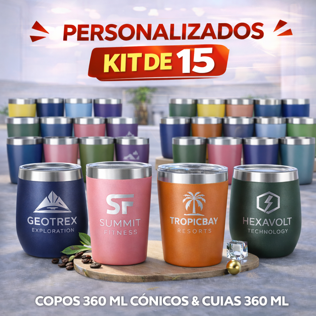 Kit 15 Unid Copo Térmico 360ml Inox Cônico ou Cuia – Gravação a Laser Personalizada Exclusiva