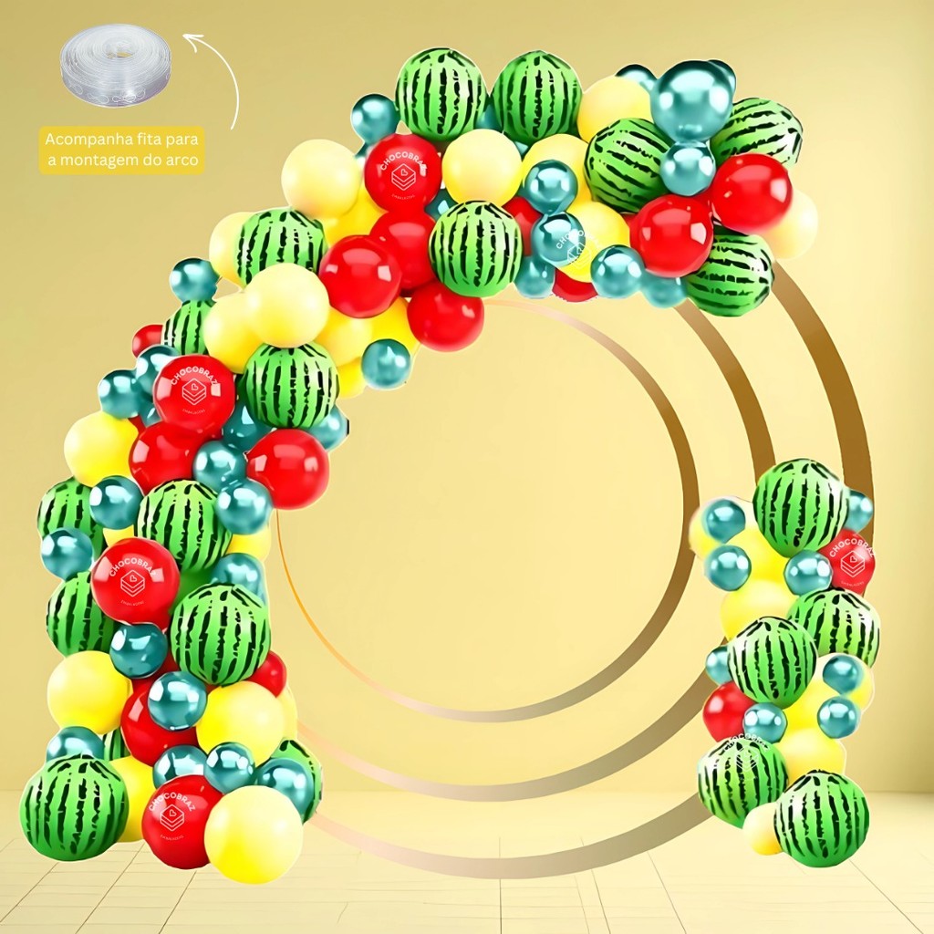 QUANTIDADE - 1 Pacote com 50 unidades AMARELO 7 Polegadas - 1 Pacote com 50 unidades VERMELHO 7 Polegadas - 1 Pacote com 25 unidades VERDE CROMADO 5 Polegadas - 1 Pacote com 25 unidades MELANCIA 9 Polegadas 1 ROLO DE FITA ARCO DESCONTRUIDO 5 METROS Total: 150 unidades TAMANHO - Tamanho: 9" polegadas (23cm de Diâmetro - Cheio) - Tamanho: 7" polegadas (18cm de Diâmetro - Cheio) - Tamanho: 5" polegadas (13cm de Diâmetro - Cheio) DETALHES DO PRODUTO - Marca HAPY DAY - Modelo Liso/Cromado - Material Látex - Linha Profissional - Brilho Intenso - Cores Vibrantes - Não Solta Tinta