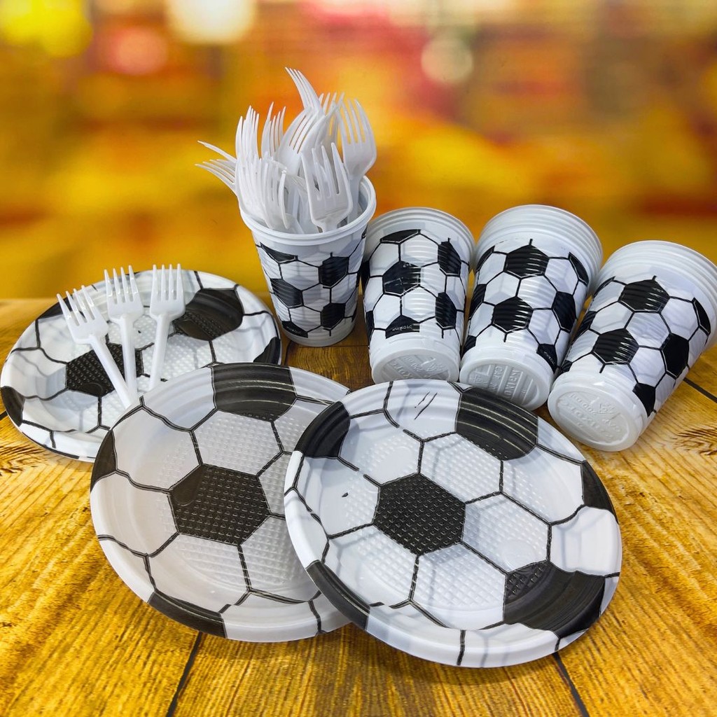 KIT 150 ITENS FESTA FUTEBOL DESCARTÁVEL COMPOSTO POR 50 COPOS DE PLASTICO 50 PRATOS DE PLASTICO 50 GARFOS BRANCO IDEAL PARA FESTAS TEMÁTICAS E EVENTOS ESPORTIVOS, OFERECENDO PRATICIDADE, ESTILO E UM VISUAL DIVERTIDO PARA SERVIR E DECORAR, DEIXANDO SUA COMEMORAÇÃO NO CLIMA DO FUTEBOL.