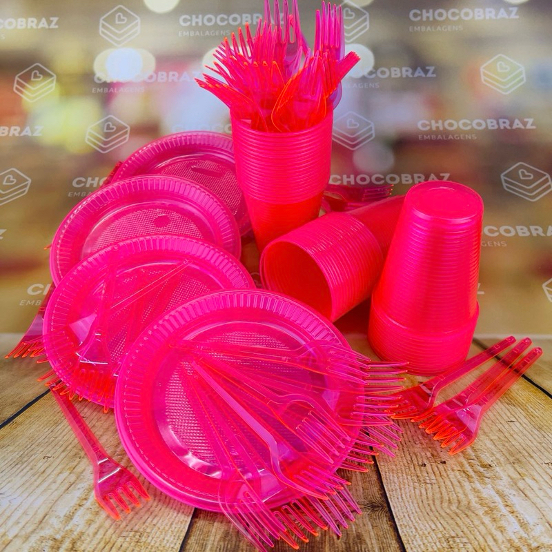 KIT 150 ITENS FESTA NEON 50 GARFINHO + 50 PRATINHO + 50 COPO DESCARTAVEIS BELLO COPO CORES NEON