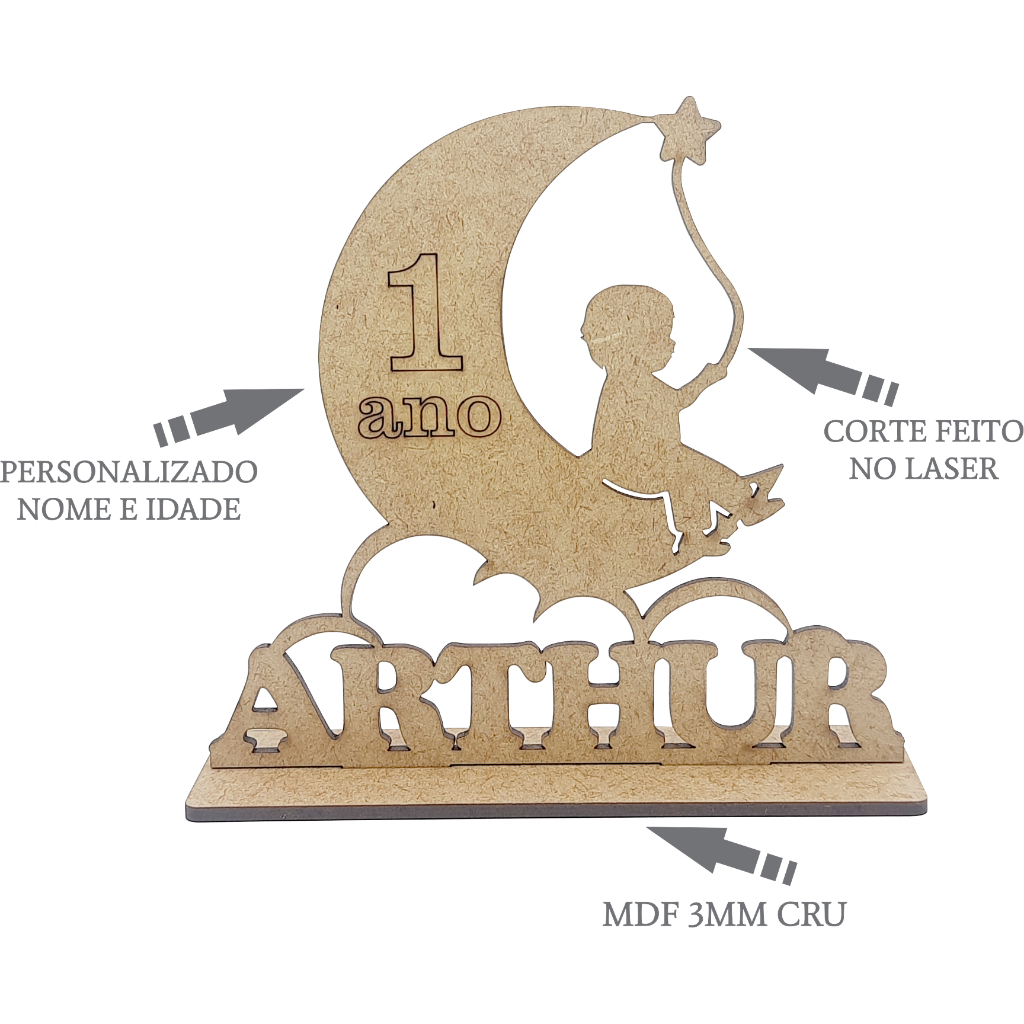 Encante a festa com esta adorável lembrancinha em MDF cru de 3mm! Uma criança sorridente segurando balões, sentada na lua, torna-se o presente perfeito para celebrar aniversários. Personalize com nome e idade, proporcionando um toque especial a essa lembrança encantadora. Feito em MDF de qualidade, com corte a laser, fornecendo melhor acabamento e maior detalhe a peça PERSONALIZAÇÃO: Pode personalizar com nomes, iniciais e idade, basta enviar no chat de mensagens após a compra. Medidas: Altura: 12cm Comprimento: 13cm *O tamanho pode variar de acordo com o tamanho do nome* - Base e lembrancinha encaminhados soltos, para evitar dano a peça. Fácil montagem, tipo encaixe. - Pode ser utilizado cola branca ou cola instantânea para a fixação. *Fabricamos outras quantidades, basta solicitar pelo chat*