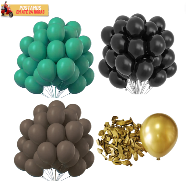 🥇 Produto à Pronta Entrega 🚛 (Enviamos) sua compra em até 24h 🔥O ENVIO MAIS RÁPIDO DA SHOPEE! PRODUTO NO BRASIL!🔥 🚨 ATENÇÃO! NÃO ACOMPANHA PAINEL, O KIT REFERE-SE APENAS AOS BALÕES.🚨 🚨 Pode haver uma pequena variação de tonalidade devido a luminosidade do monitor ao visualizar o anuncio.🚨 🚨 O Kit refere-se somente aos balões latex redondos conforme a descrição abaixo - Cada Balão tem seu tamanho descrito em polegadas ou em centímetros. - Siga as orientações dos fabricantes nas embalagens. Kit com 175 Balões Perfeito para a Decoração da sua Festa. Kit Contem: 50 Balões Latex Preto 6,5 polegadas 50 Balões Latex Verde Escuro 6,5 polegadas 50 Balões Latex Marrom 6,5 polegadas 25 Balões Cromado Dourado 5 polegadas