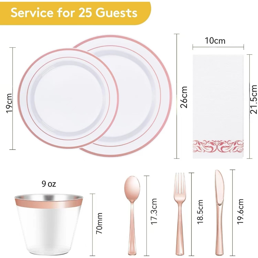 Kit 175 Ouro Rosa Luxo Descartável Talheres E Pratos Copos Conjunto para 25 convidados, conjunto resistente para festas