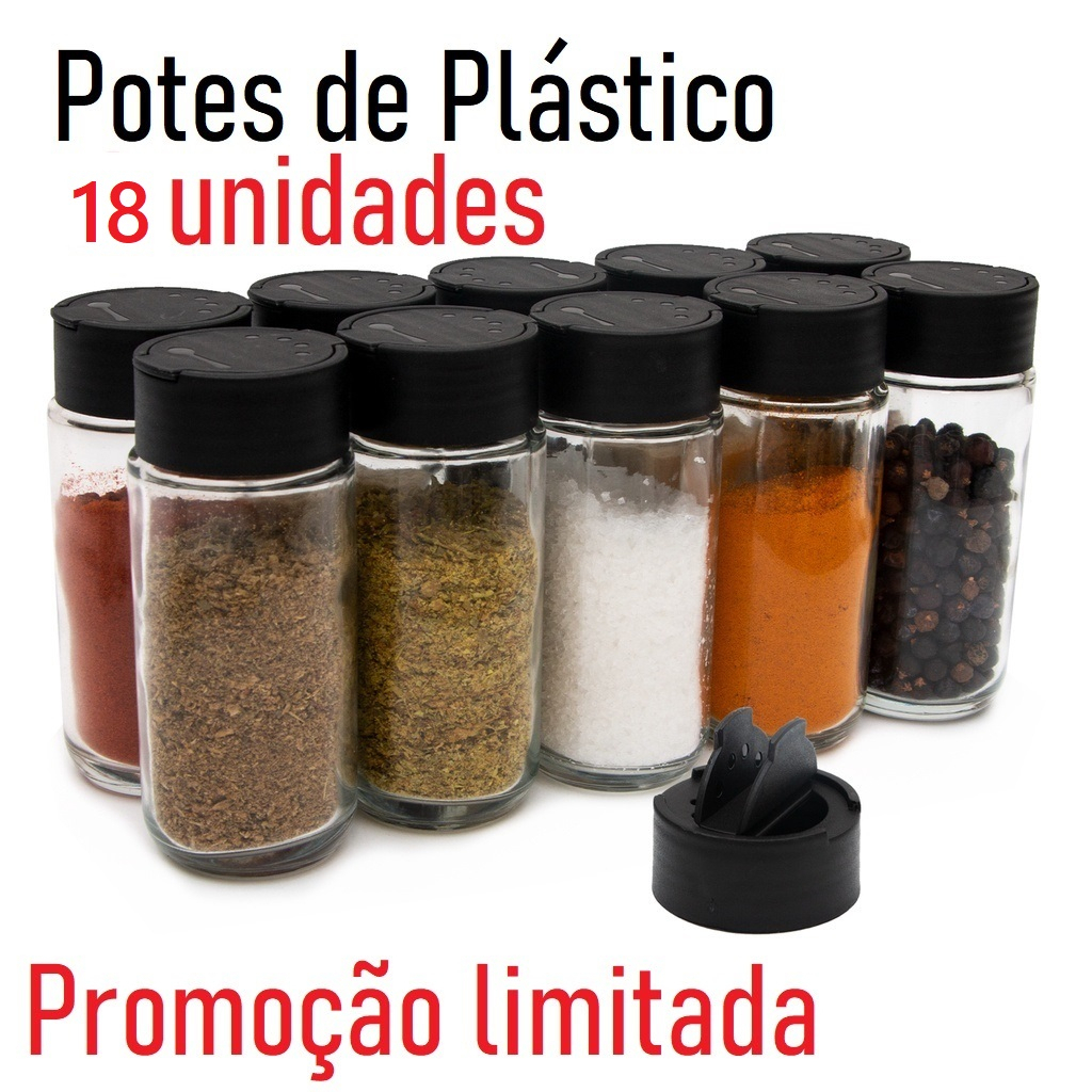 | Kit 18 Potes Tempero Condimentos Tampa Dosadora Dupla de Plástico -... este produto | R$ 10,00 | 23% | 4.7/5 | 394 |