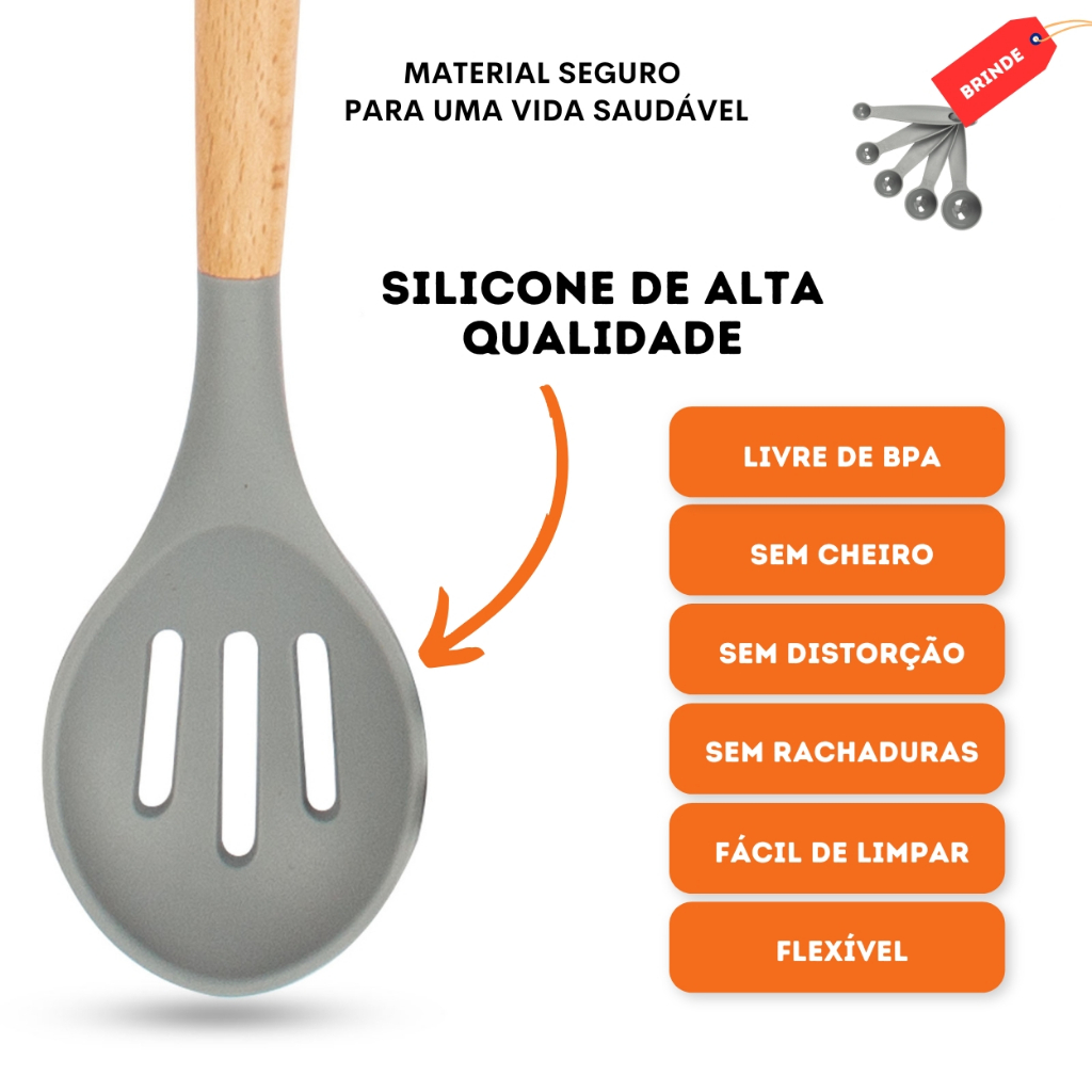 Os utensílios domésticos de silicone têm se tornado cada vez mais populares nas cozinhas modernas. Feitos a partir de um material flexível, durável e resistente ao calor, o silicone é uma escolha prática e versátil para o uso no dia a dia. Confira alguns benefícios: Resistência ao calor (-40 a 240). Ao contrário de utensílios de plástico, que podem derreter ou deformar sob altas temperaturas; O silicone é naturalmente resistente a grudações, não risca, não danifica suas panelas; É um material flexível e macio, o que o torna perfeito para uso em tigelas, formas de bolo e outros utensílios que precisam se adaptar a diferentes formatos; São fáceis de manusear, podendo ser dobrados, torcidos e amassados sem perder sua forma original; São fáceis de limpar, exigindo menos esforço para remover resíduos de alimentos; Itens Inclusos: 1- Faca Chef 1- Faca de Fatiar 1- Faca de Pão 1- Faca Universal 1- Faca de Frutas 1- Tesoura 1- Tábua de Cortar 1- Espátula Sólida 1- Colher para Servir 1- Espátula Vazada 1- Colher Raspadora 1- Colher Raspadora 1- Colher Escumadeira 1- Pegador de Macarrão 1- Concha de Sopa 1- Pincel Culinário 1- Pinça Pegador 1- Batedor 1- Baldinho Organizador com saída de água ESPECIFICAÇÕES: Material: Silicone, aço inox e Madeira Peso Total: 2.4kg Faca Chef Peso: 142g Faca de Fatiar Peso: 114g Faca de Pão Peso: 119g Faca Universal Peso: 54g Faca de Frutas Peso: 47g Tesoura Comprimento: 20cm Largura: 8,5cm Peso: 72g Tábua de Cortar Comprimento: 32,7cm Largura: 20cm Peso: 337g Colher Escumadeira Comprimento: 31,5cm Largura: 7cm Peso: 66g Espátula Sólida Comprimento: 32cm Largura: 8cm Peso: 73g Colher para servir Comprimento: 31,5cm Largura: 7cm Peso: 76g Espátula Vazada Comprimento: 32cm Largura: 8,3cm Peso: 68g Colher Raspadora Comprimento: 32cm Largura: 6,5cm Peso: 83g Espátula Raspadora Comprimento: 32cm Largura: 6cm Peso: 102g Pegador de Macarrão Comprimento: 31,5cm Largura: 6,5cm Peso: 75g Concha de Sopa Comprimento: 30cm Largura: 8cm Peso: 86g Pincel Culinário Comprimento: 27cm Largura: 4cm Peso: 52g Pinça Pegador Comprimento: 26,5cm Largura: 4cm Peso: 118g Batedor Comprimento: 25cm Largura: 6cm Peso: 43g Suporte Baldinho Diâmetro: 23,5cm Profundidade: 21cm Peso: 520g Perguntas Frequentes: Acompanha NF? R: Sim todos nossos produtos acompanham Nota Fiscal; Tem garantia? R: Todos nossos produtos possuem garantia; Envio imediato? R: Produtos a pronta entrega; Utilize o campo de perguntas caso tenha alguma dúvida;