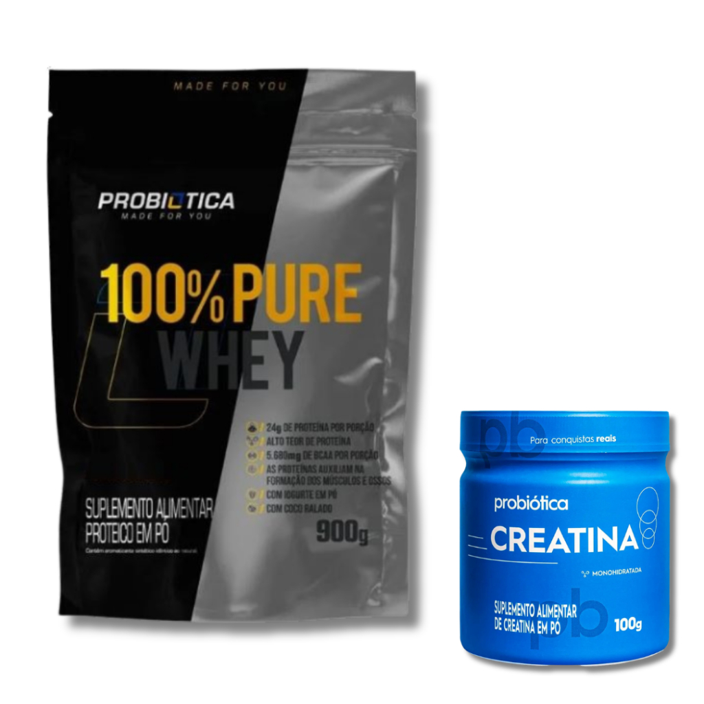 COMPRE 1 WHEY PROBIOTICA 900g E GANHE 1 CREATINA PROBIOTICA 100g! 100% PURE WHEY® é o suplemento proteico campeão de vendas Probiótica, composto basicamente por proteína concentrada do soro do leite (whey protein concentrate), matéria-prima elaborada com alta tecnologia e com elevada concentração de aminoácidos. De preparo instantâneo, 100% PURE WHEY® é indicado para ser tomado antes e/ou após os exercícios. Creatina é um produto destinado a complementar os estoques endógenos de creatina. Uma porção de 3,0g do produto (2 dosadores) contém 3,0g de creatina. A creatina auxilia no aumento do desempenho físico durante exercícios repetidos de curta duração e alta intensidade.